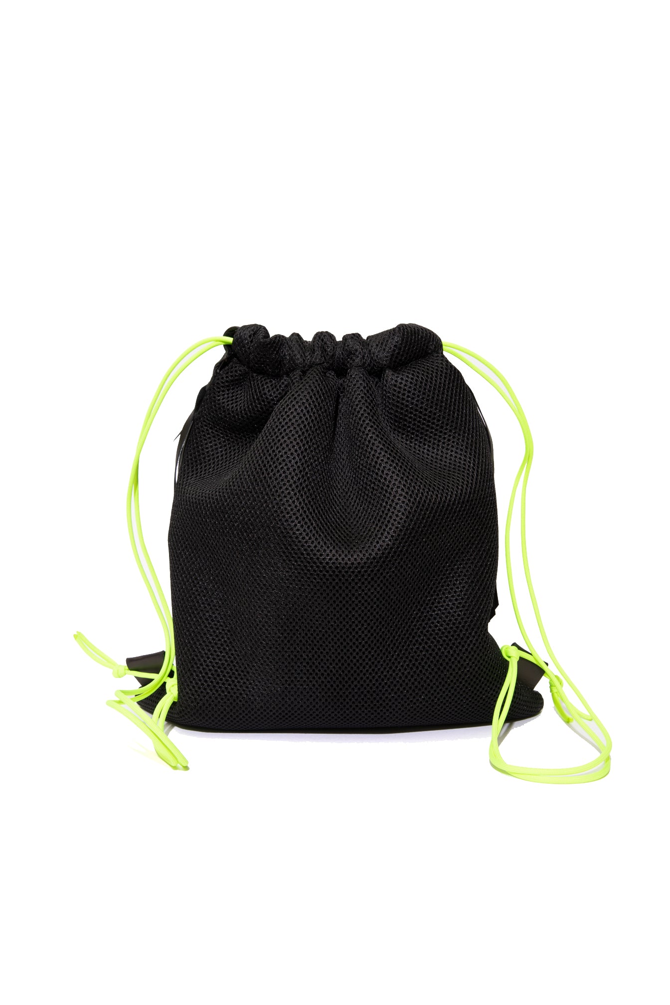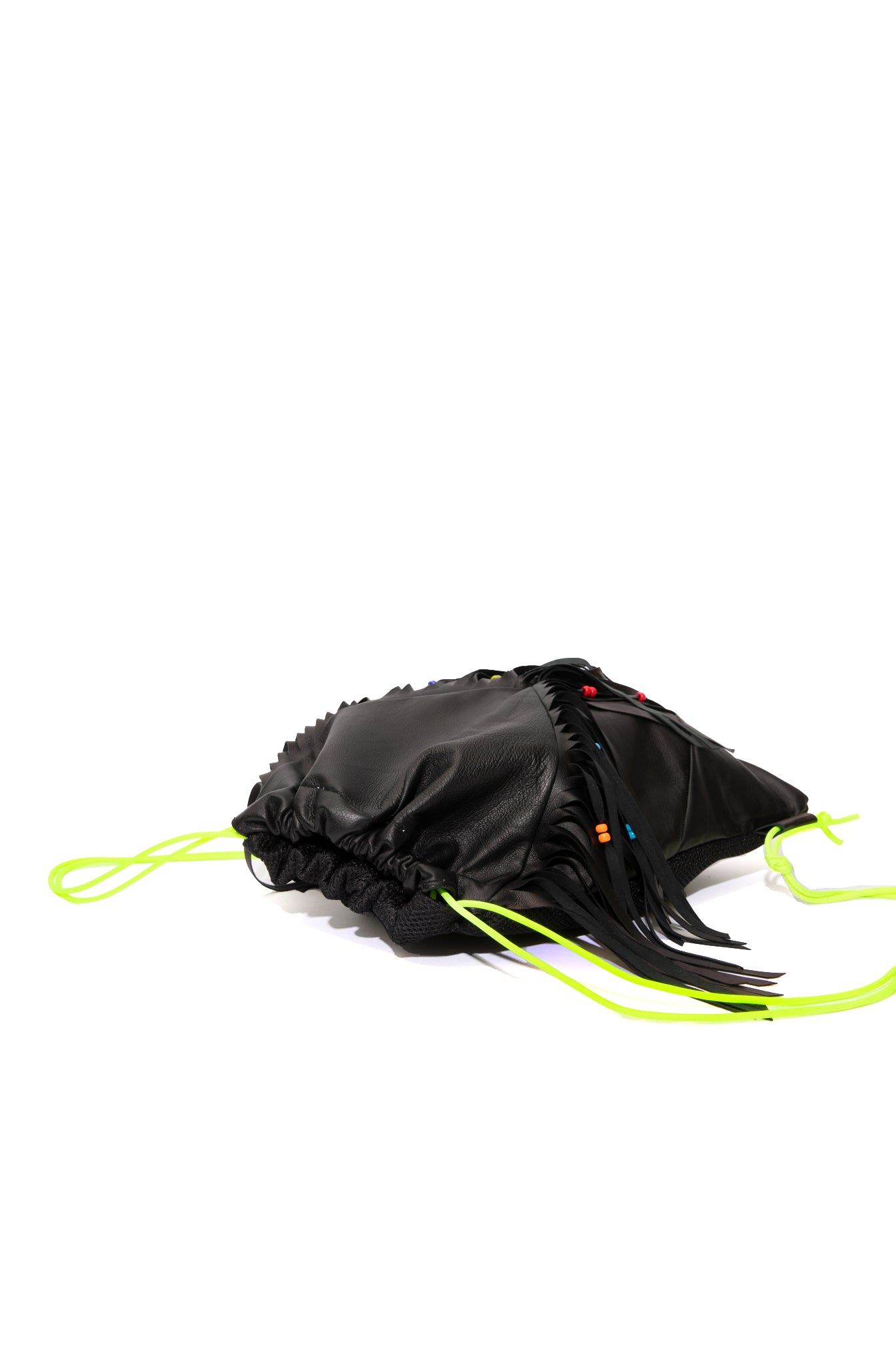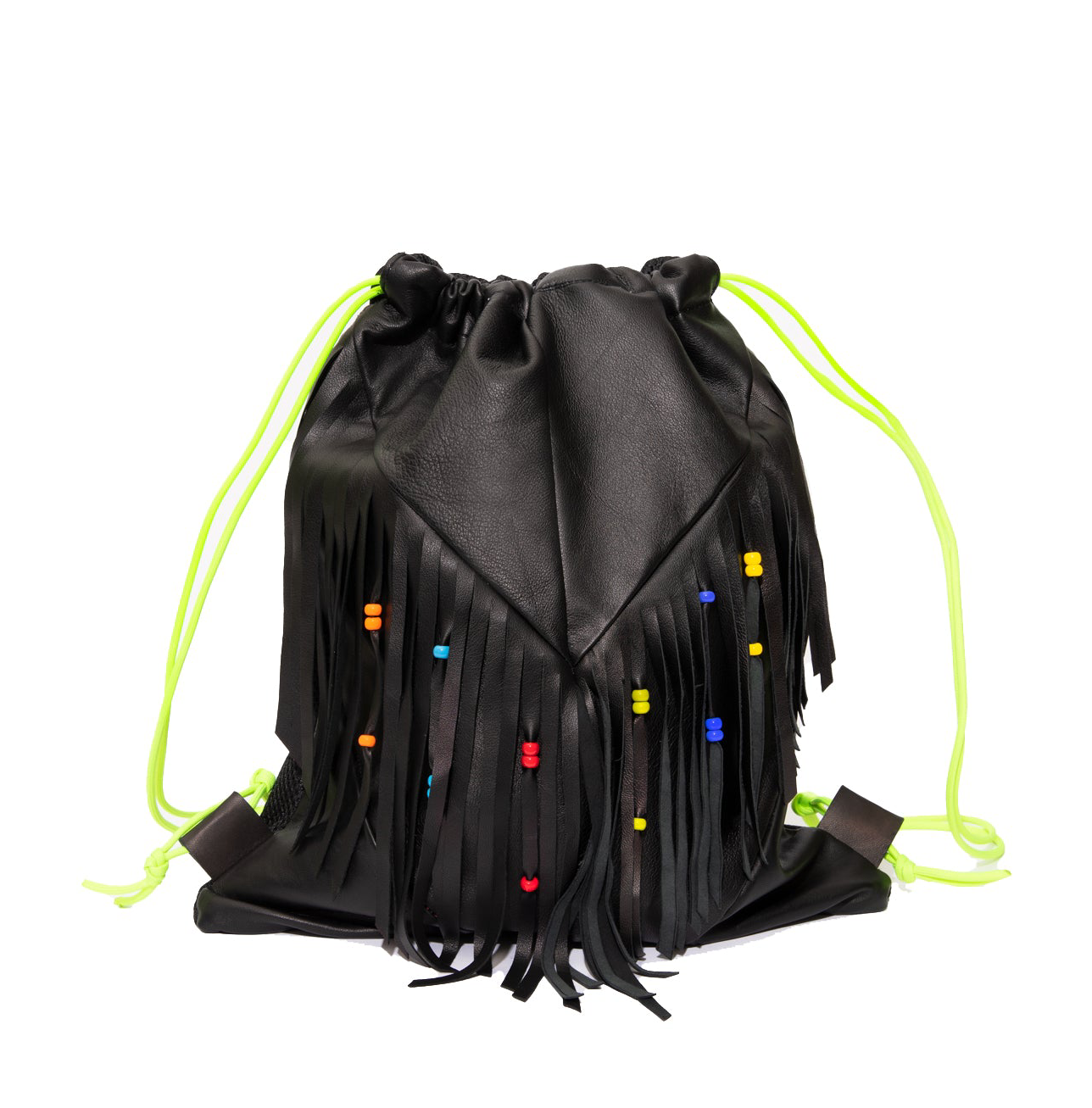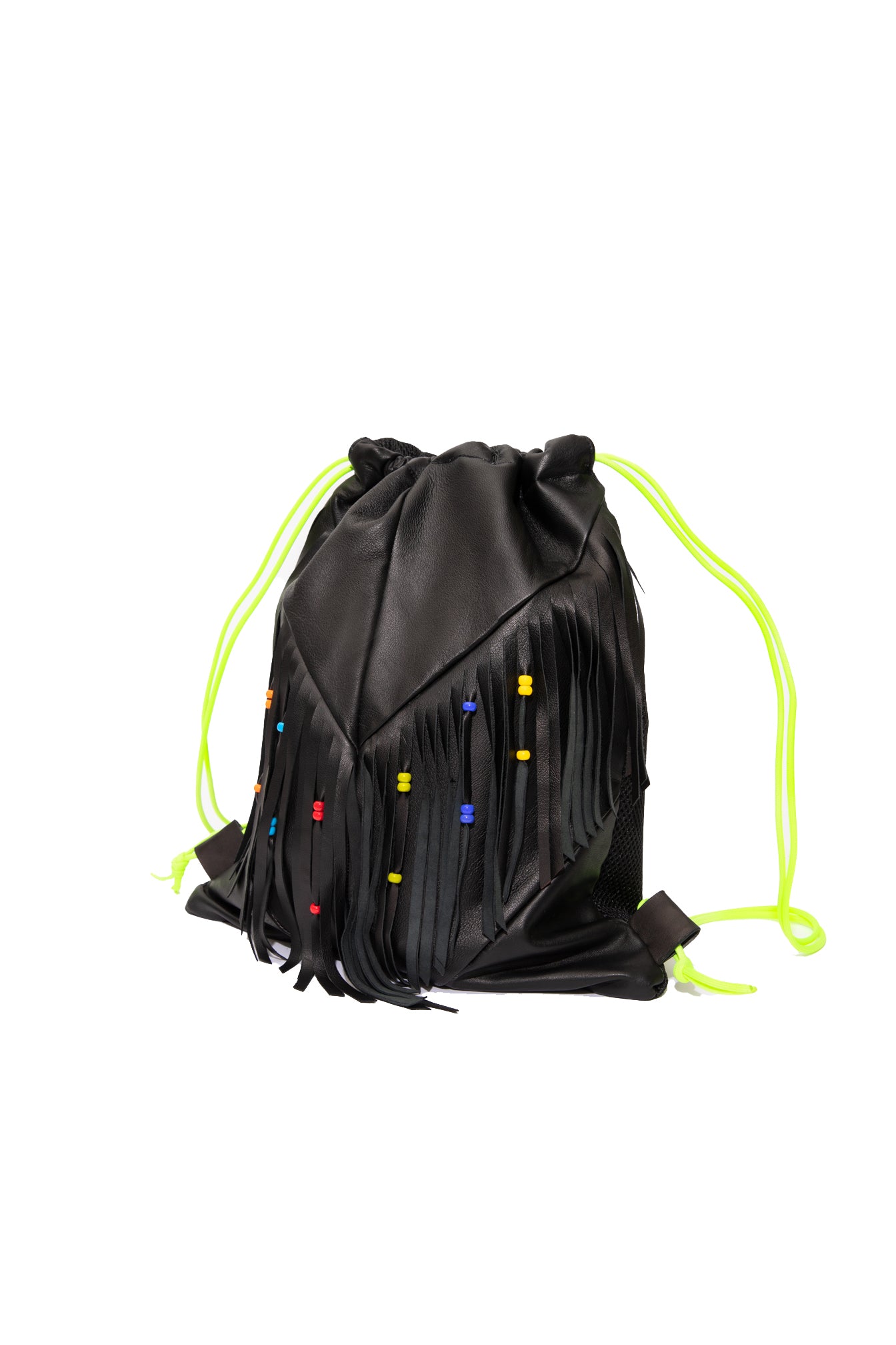 Black calfskin leather backpack with handmade fringes and multicoloured glass beads.