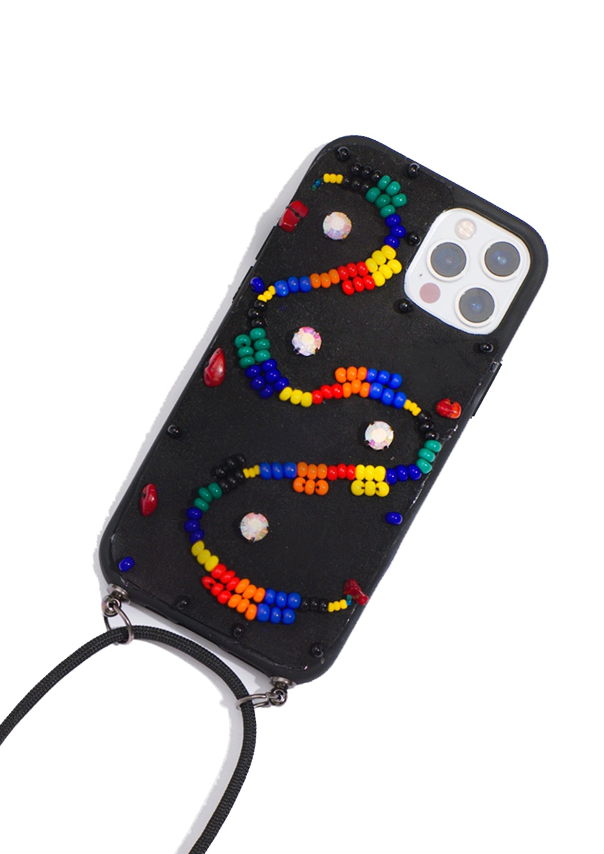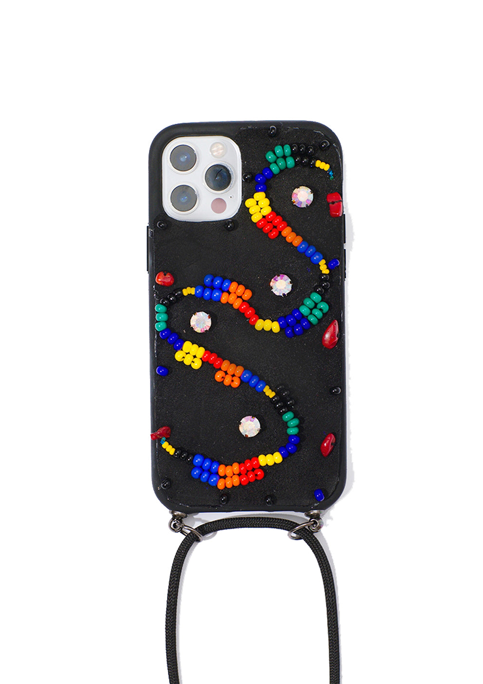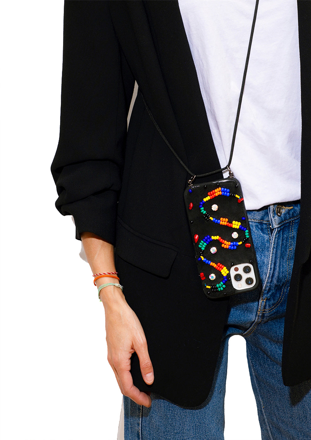 iPhone case meticulously embroidered with blue, black, and orange glass beads.