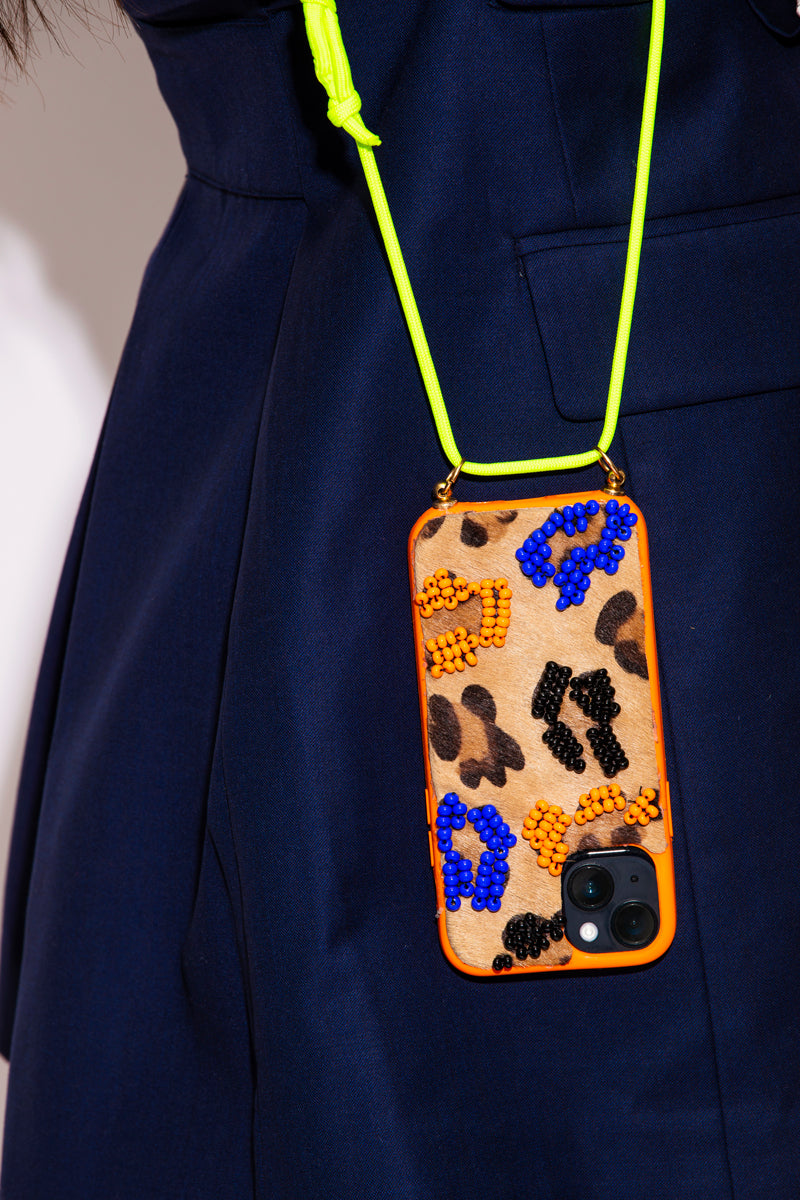 iPhone case meticulously embroidered with blue, black, and orange glass beads.