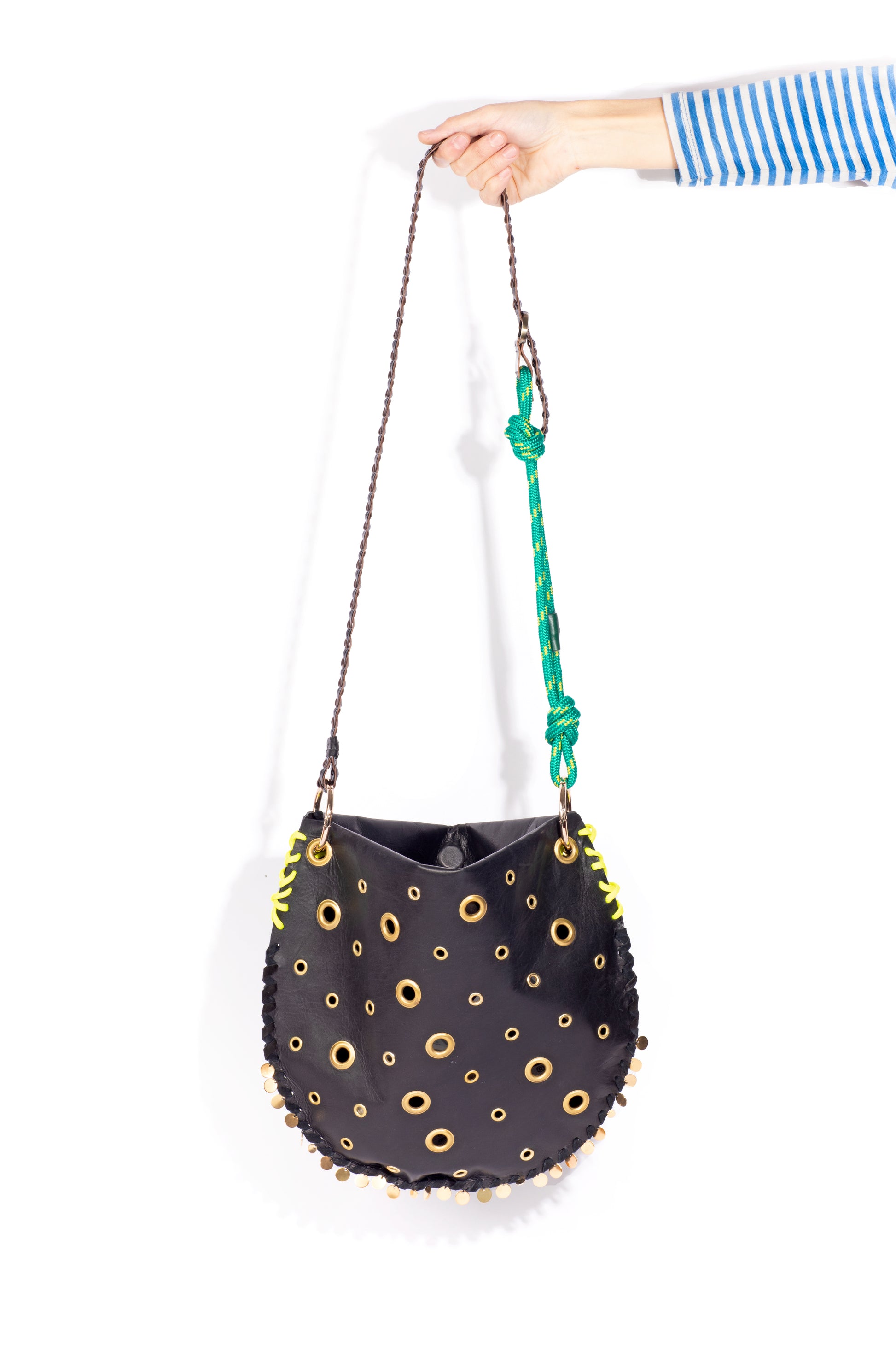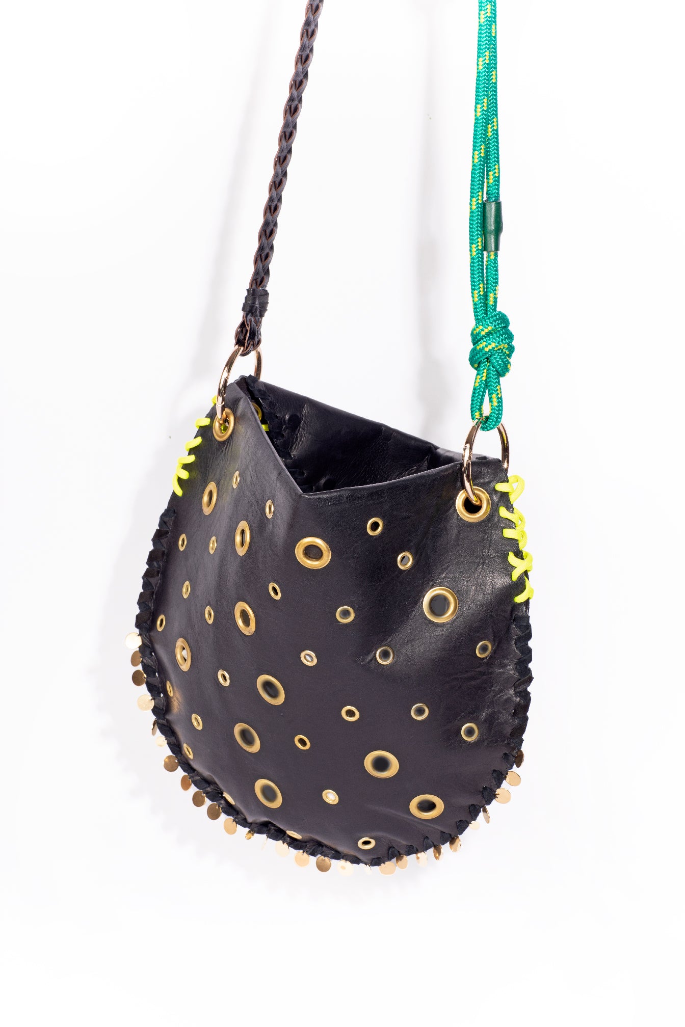 Black calfskin crossbody with gold multi-size eyelets, leather inlays, and gold medal embellishments.