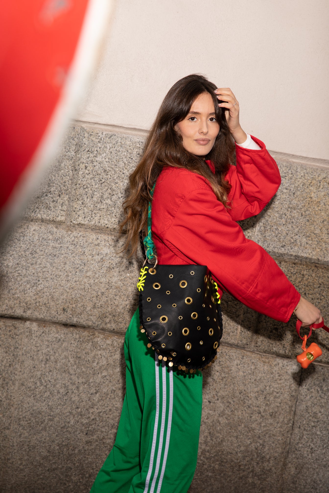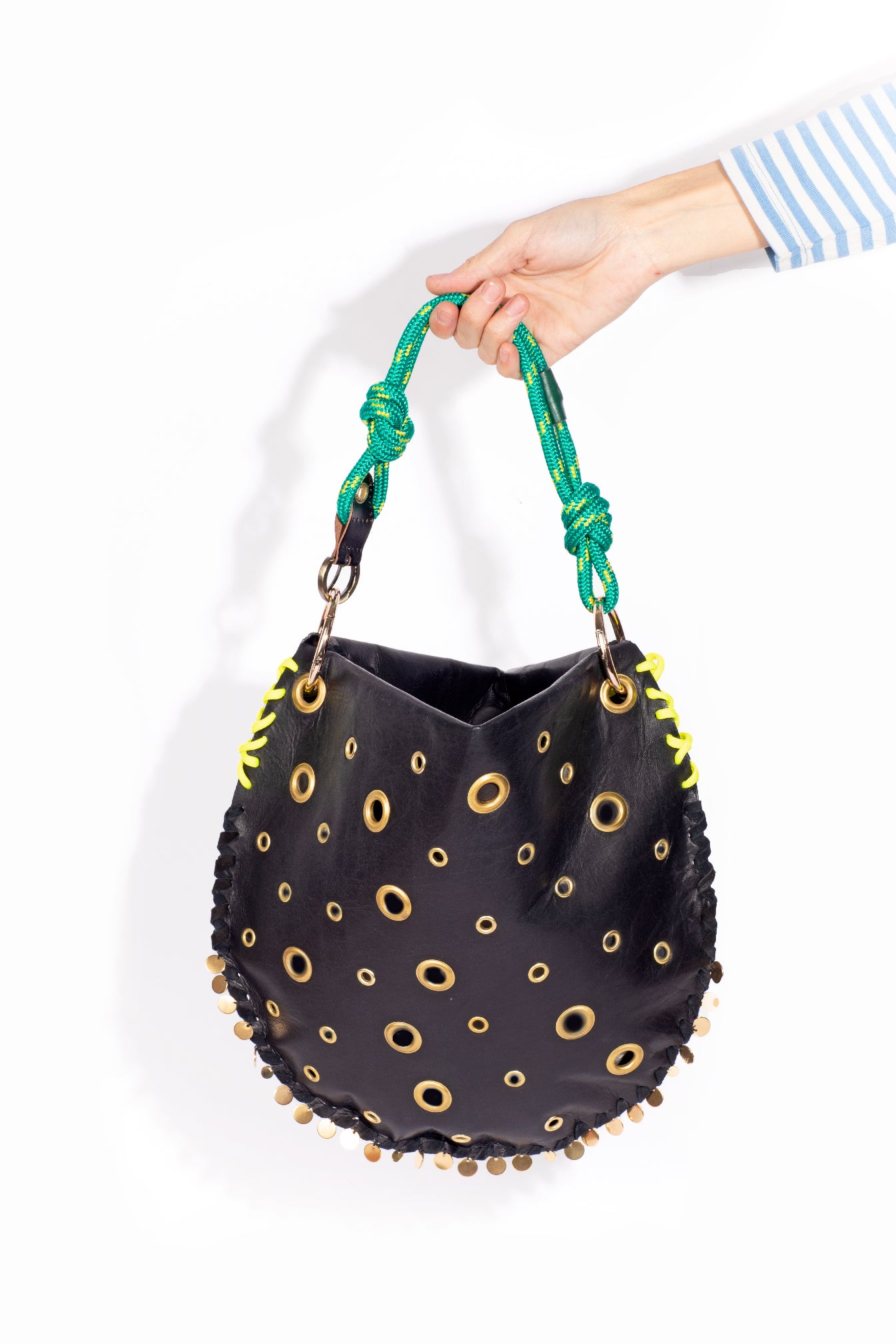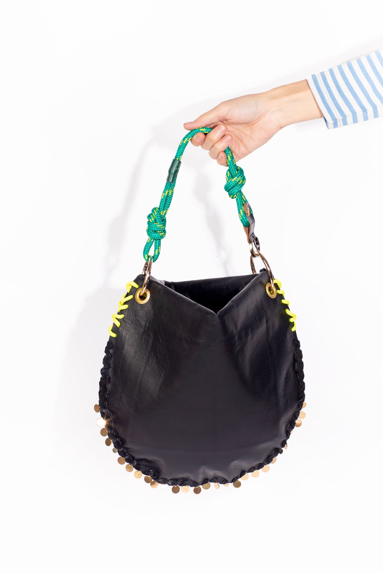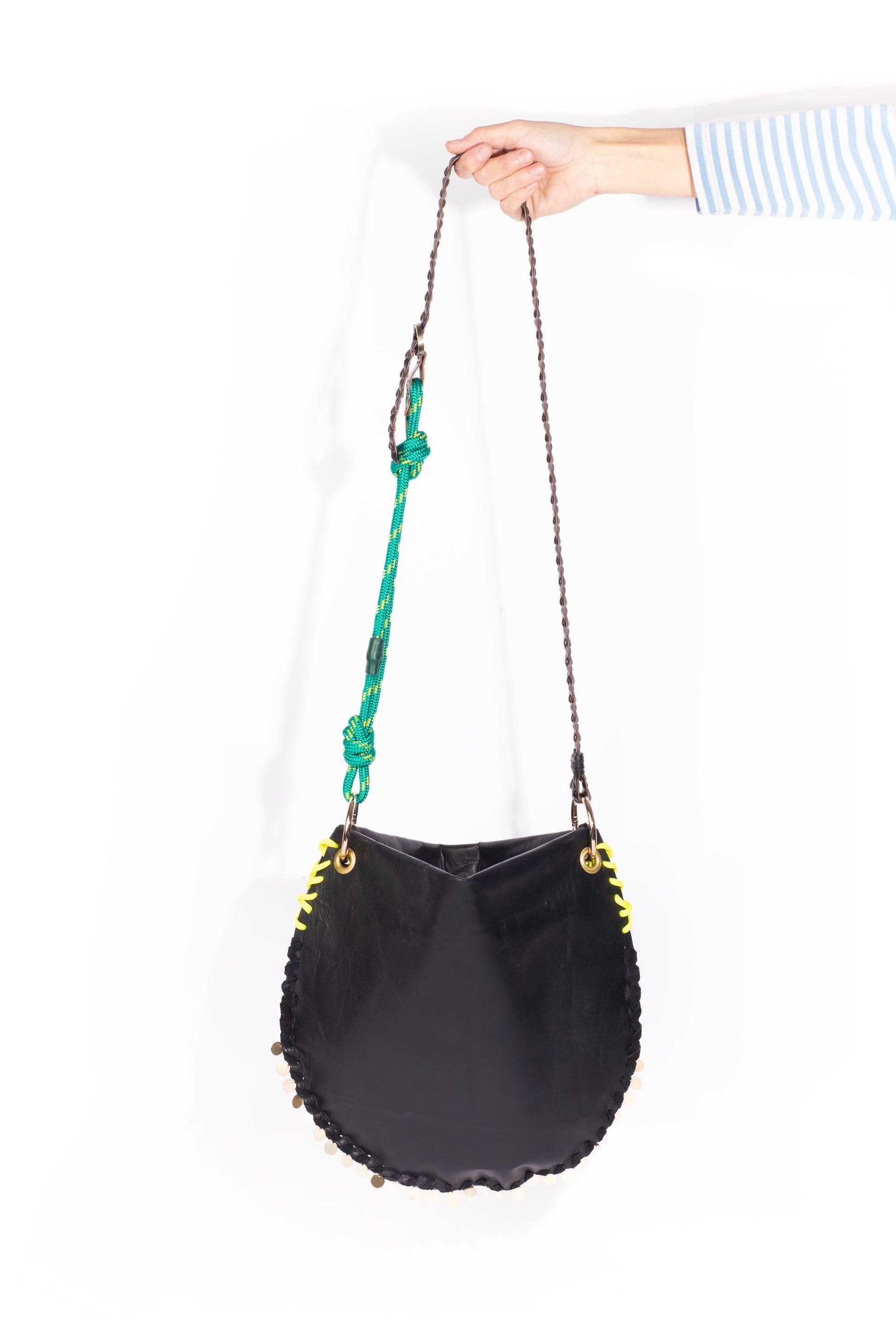 Handle in green rope, braided leather, and carabiner. Magnetic closure with large inner pocket.