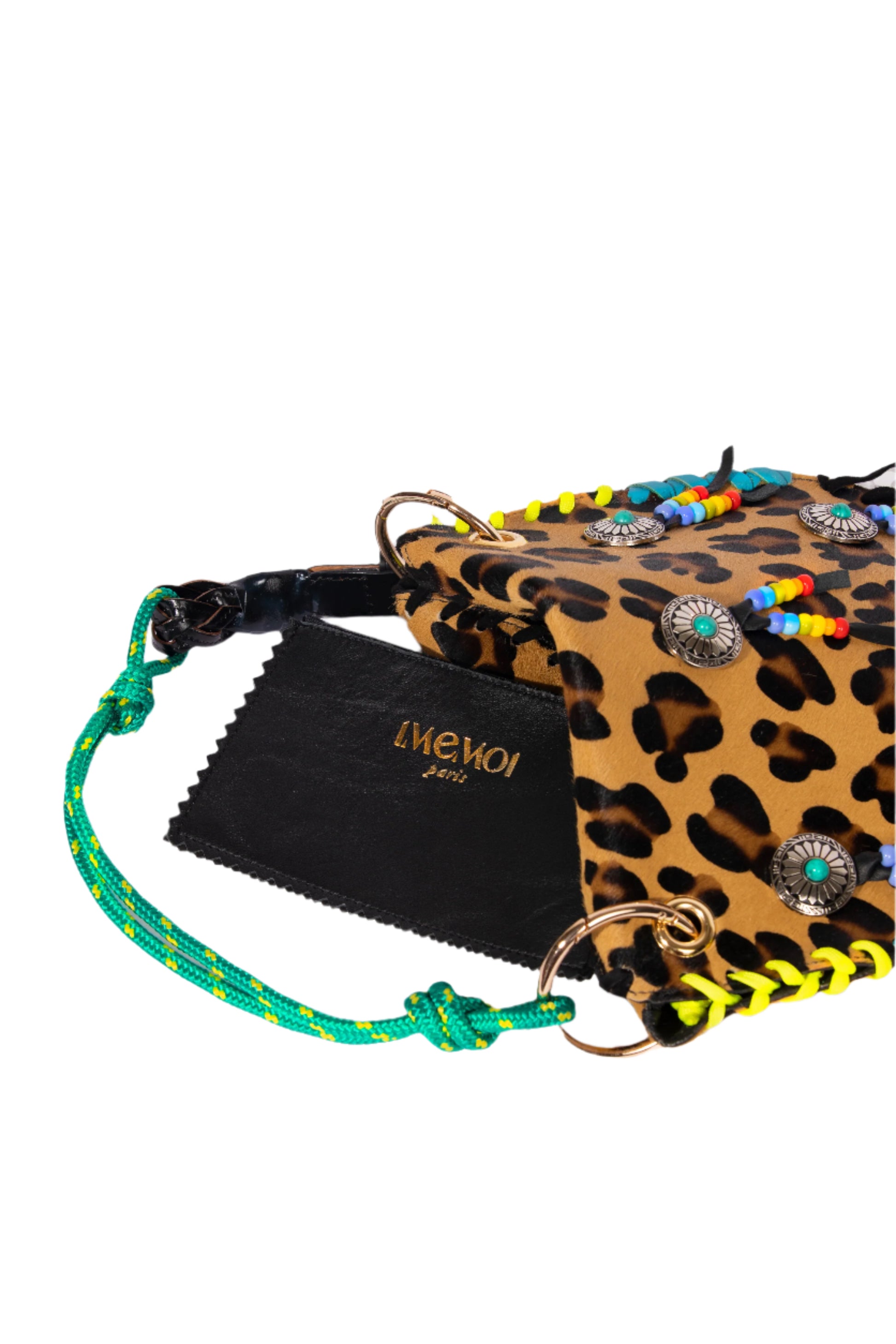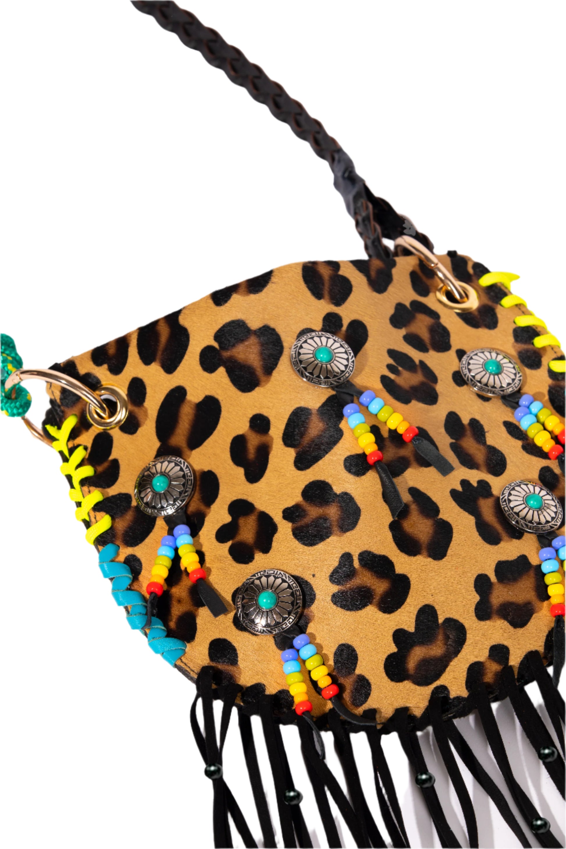 Leopard-print calfskin crossbody with concho studs, bead embroidery, leather inlays and fringes.