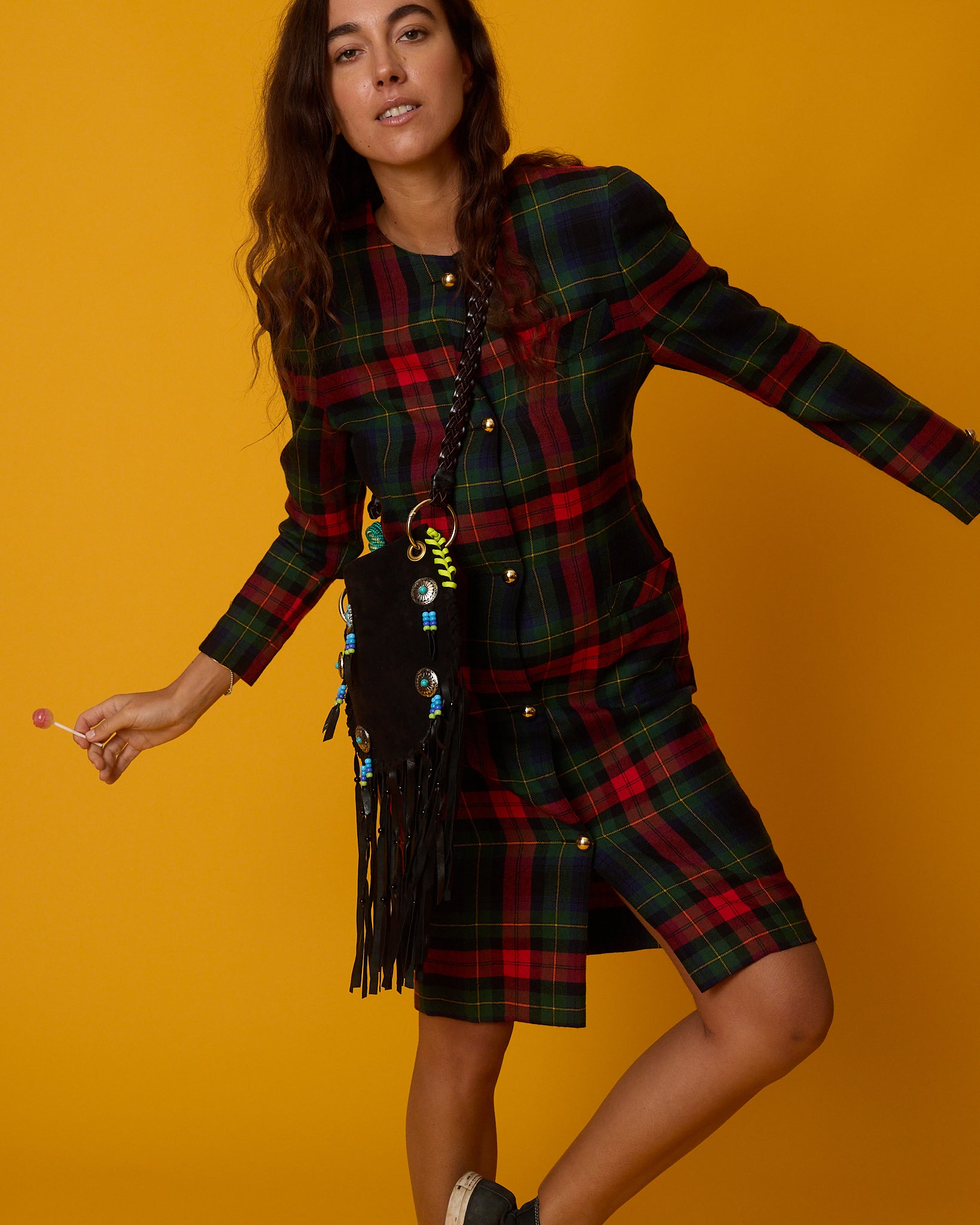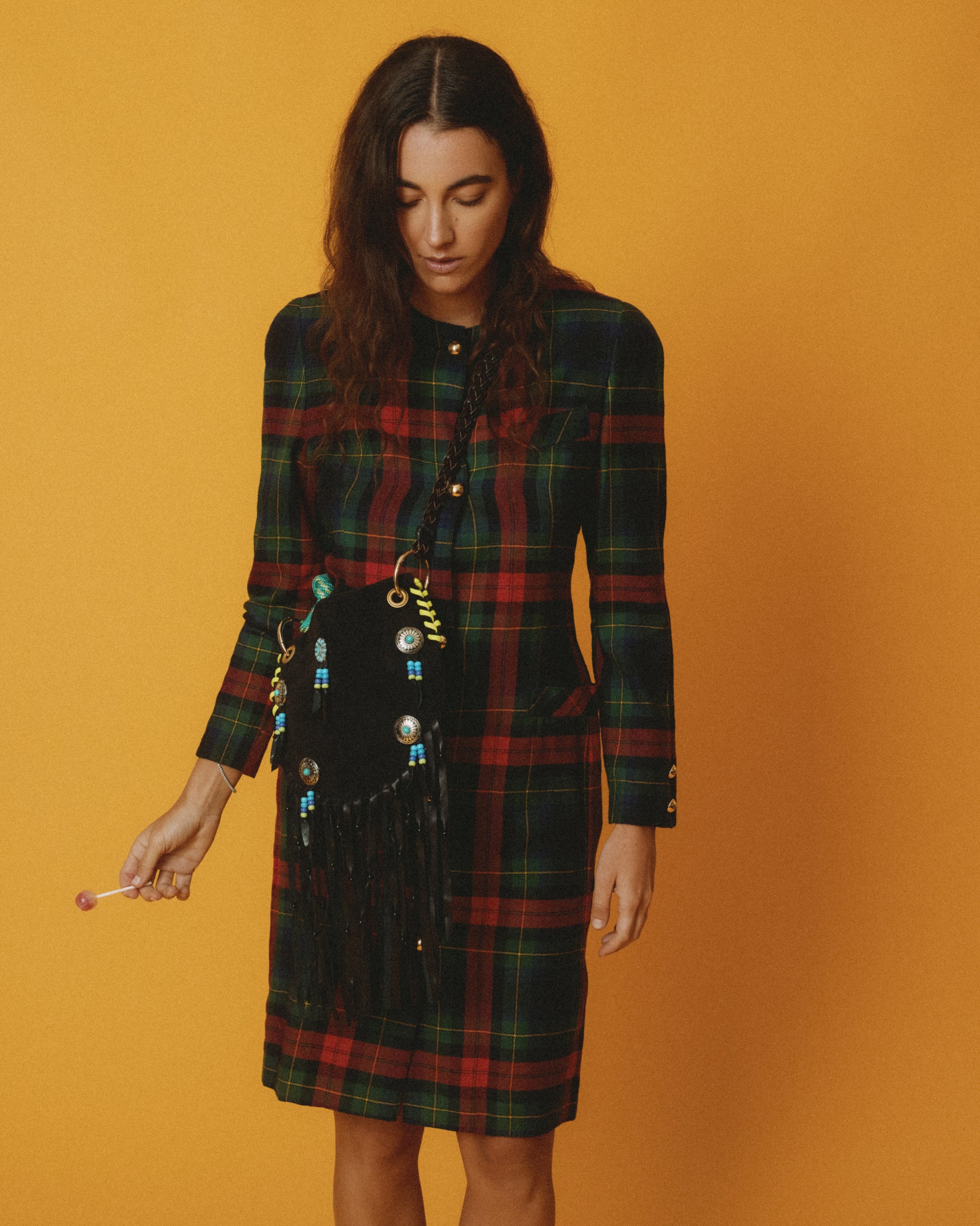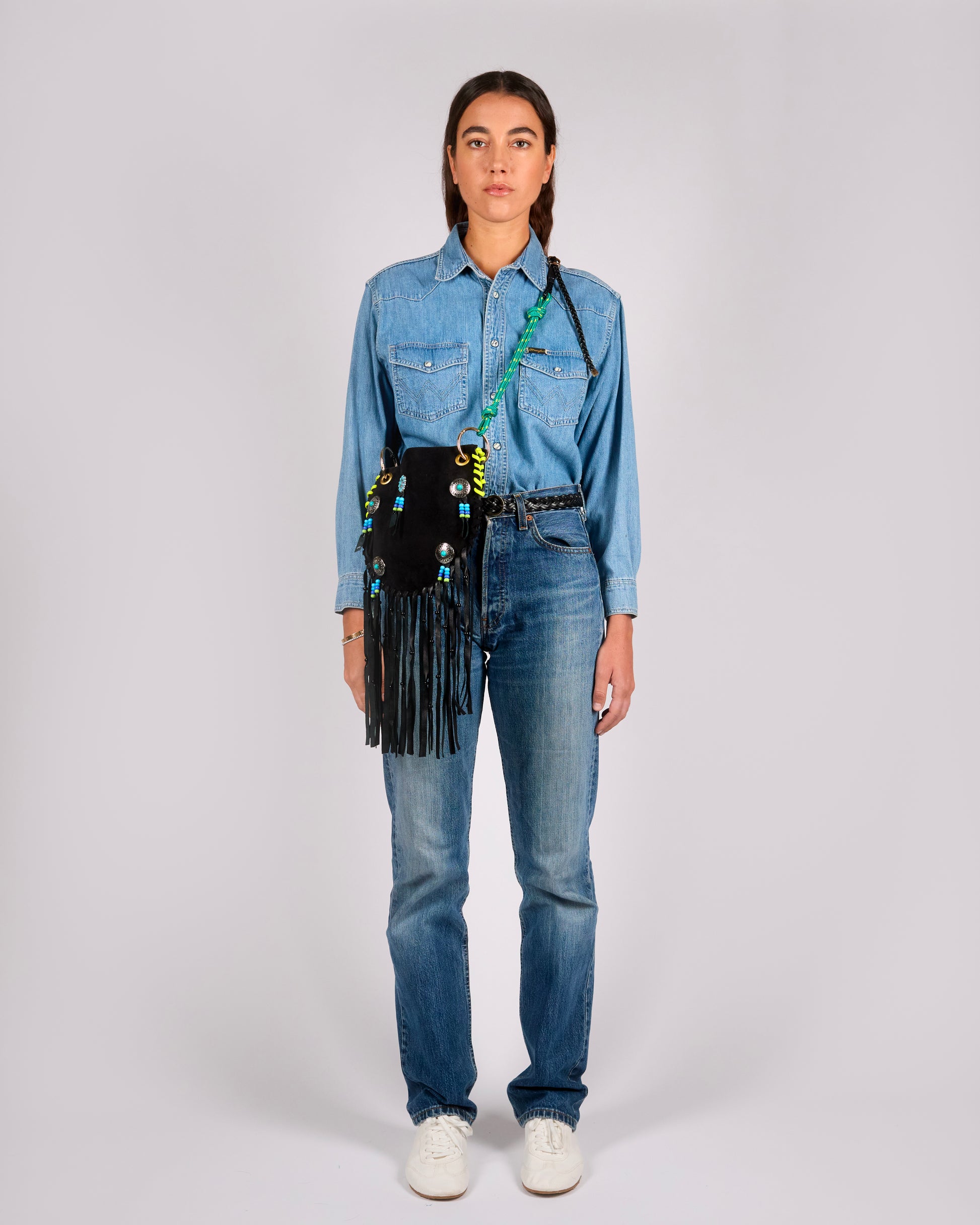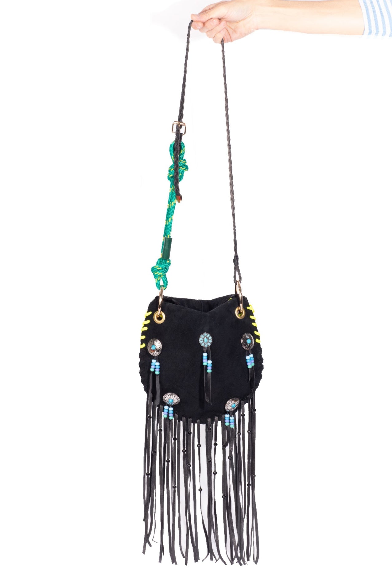 Black suede crossbody with turquoise studs, bead embroidery, leather inlays and full fringes.