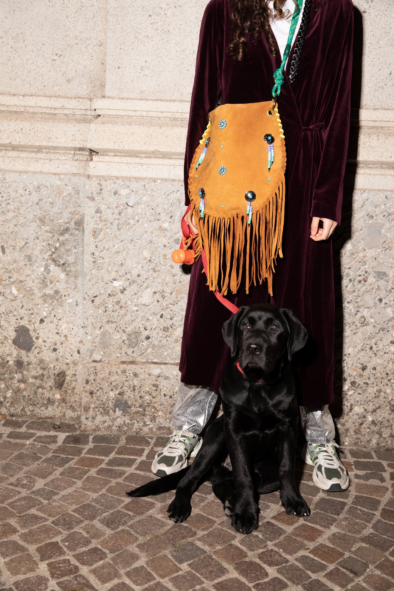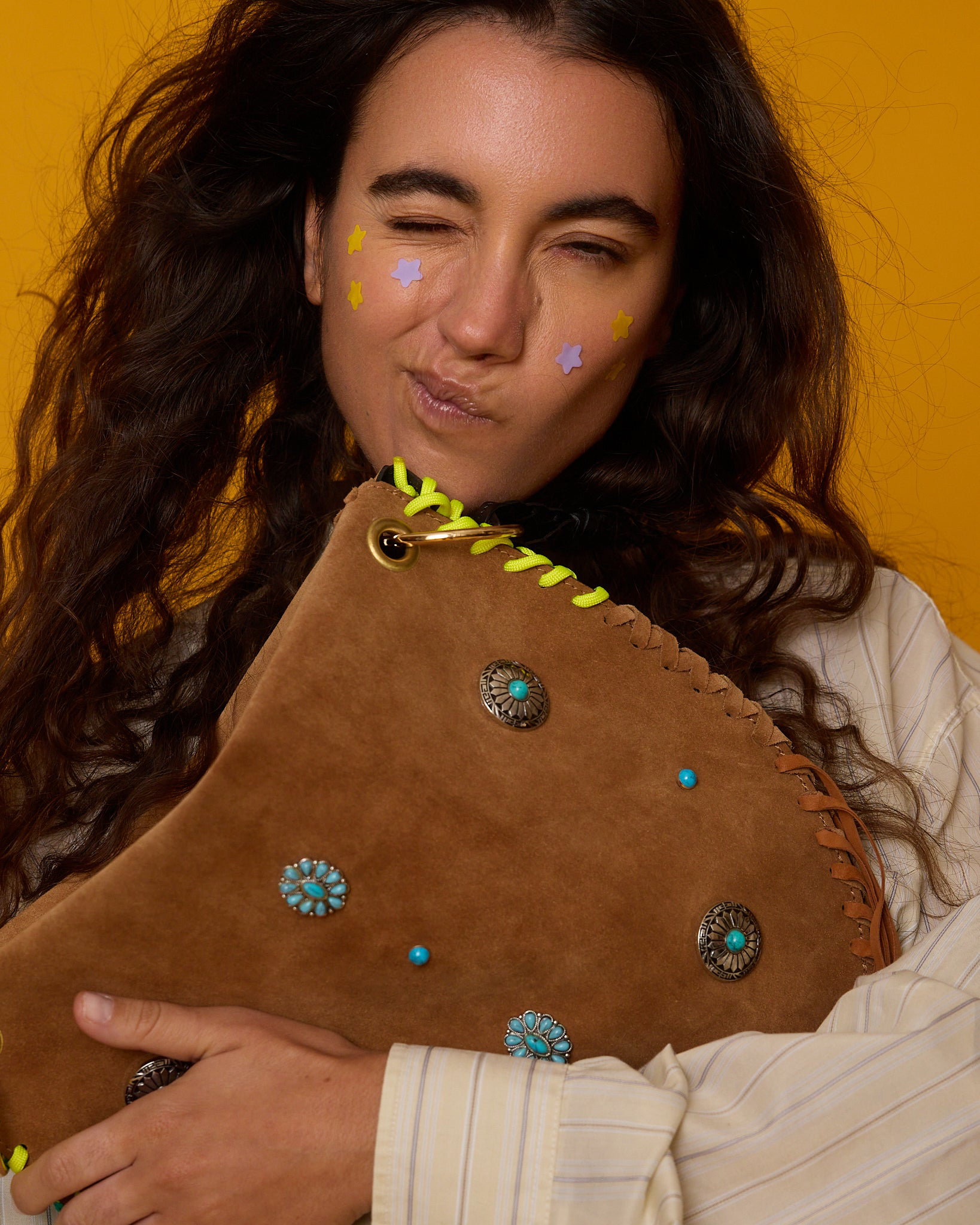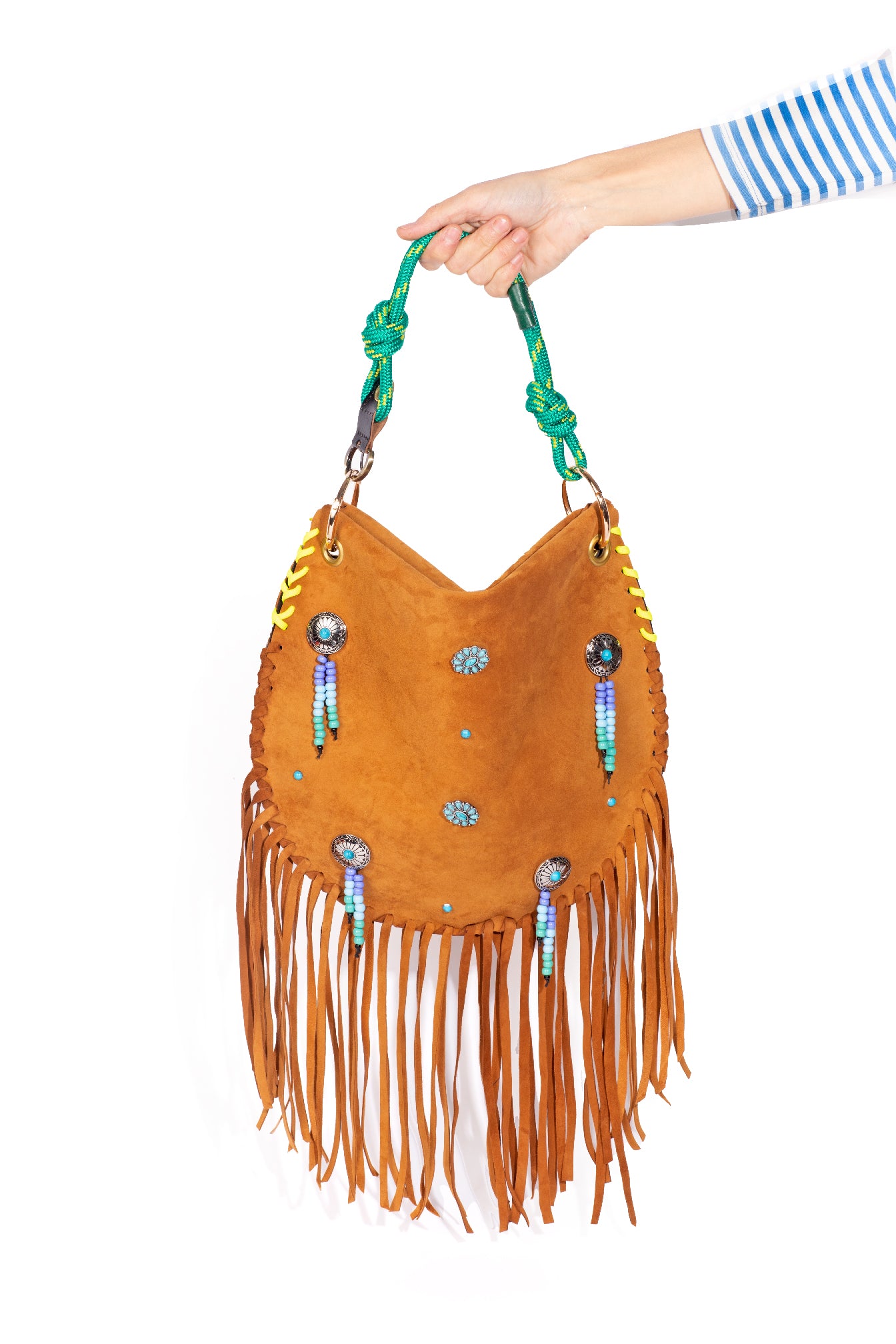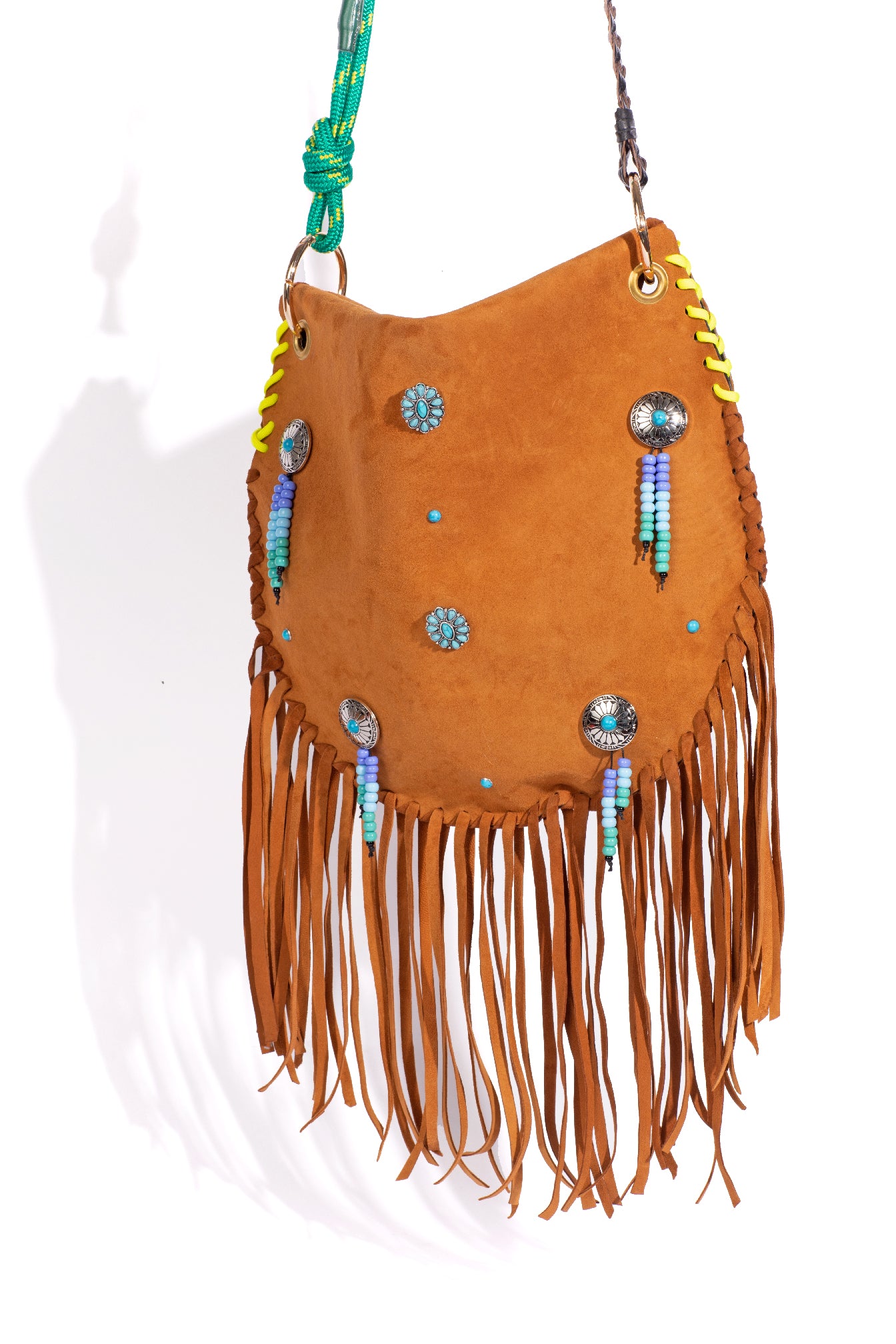 Cognac suede crossbody with turquoise studs, bead embroidery, leather inlays, and full fringes.