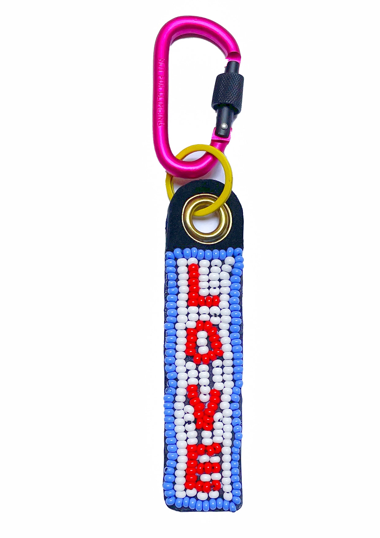 Black suede key holder with white, red, and blue glass bead embroidery.