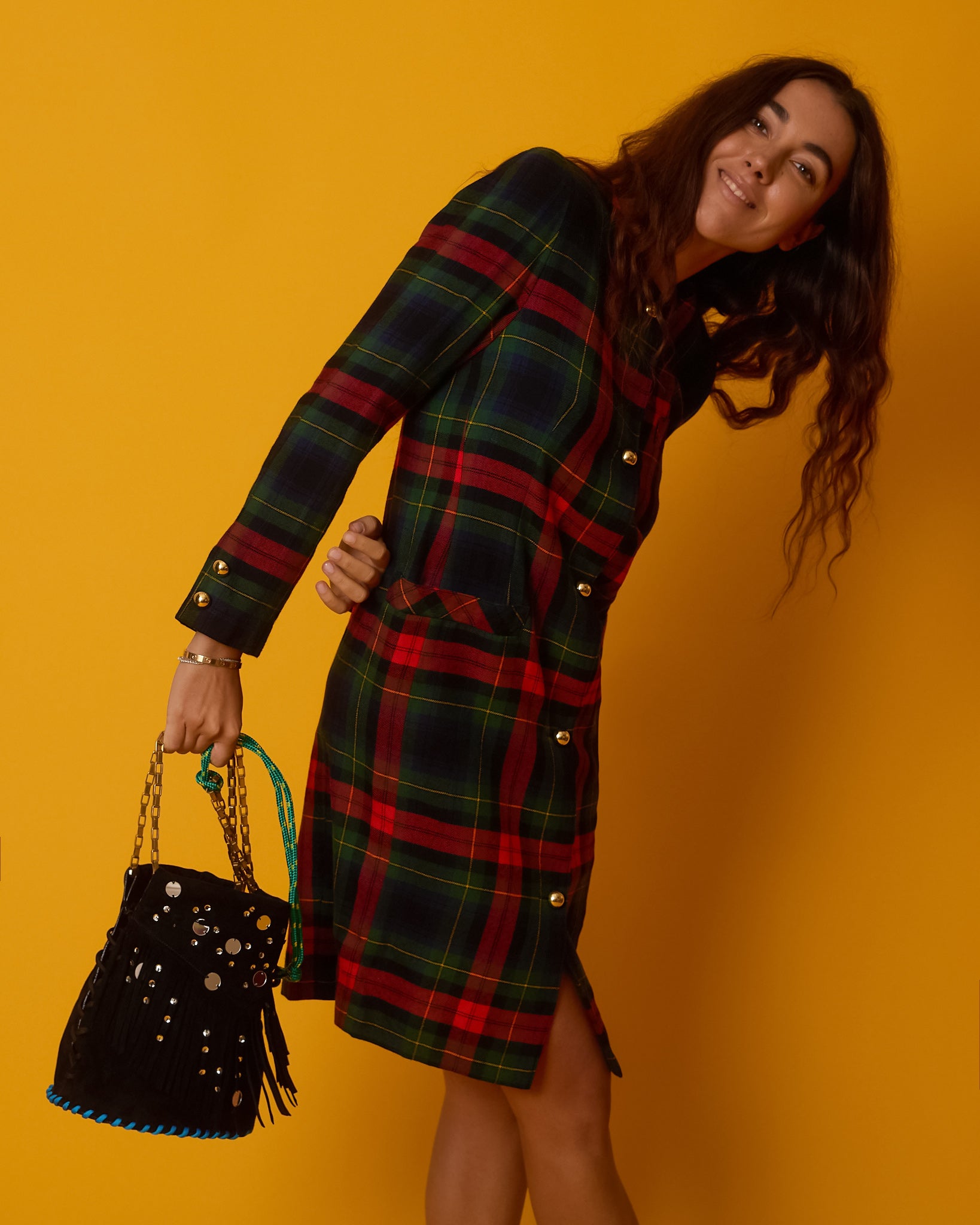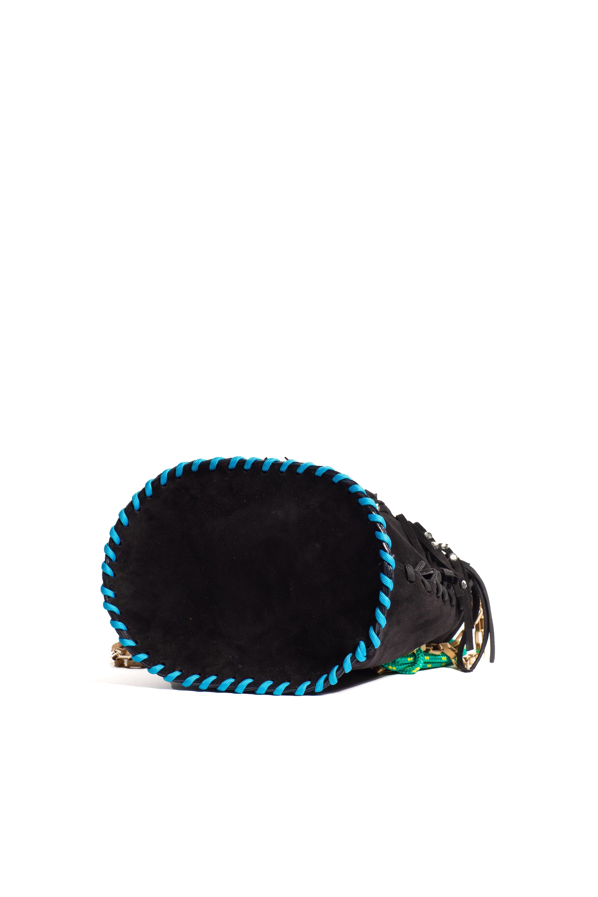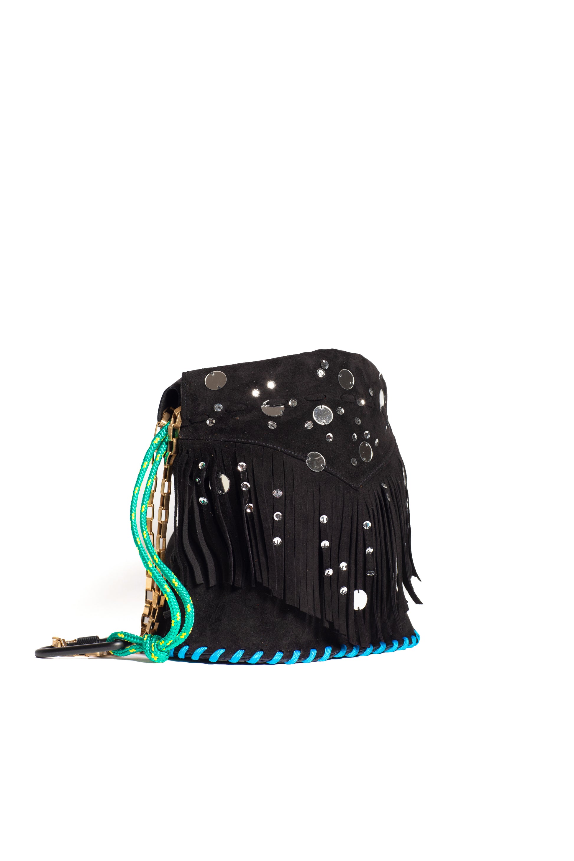 Black suede bucket bag adorned by mirrors and leather inlays.