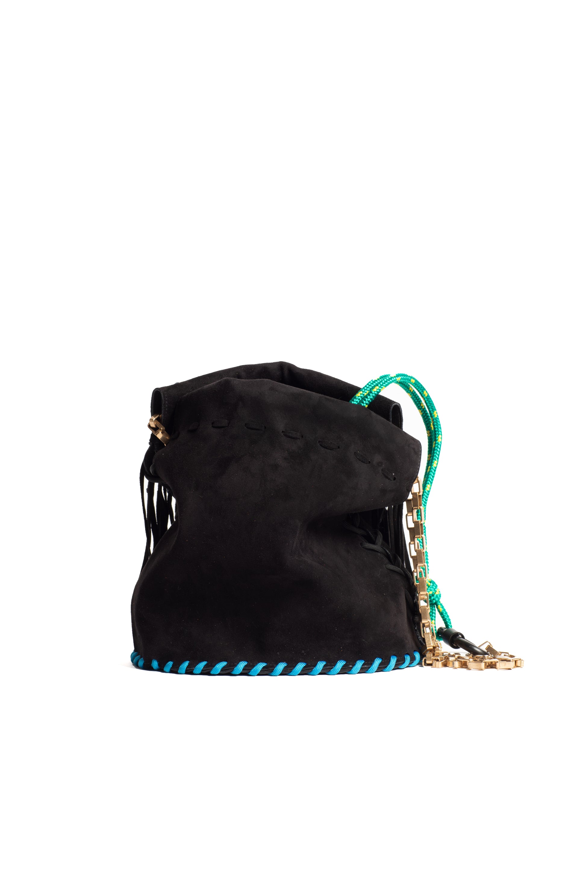 Drawstring converts to shoulder, crossbody or pouch. Brass-chain handle with carabiner.