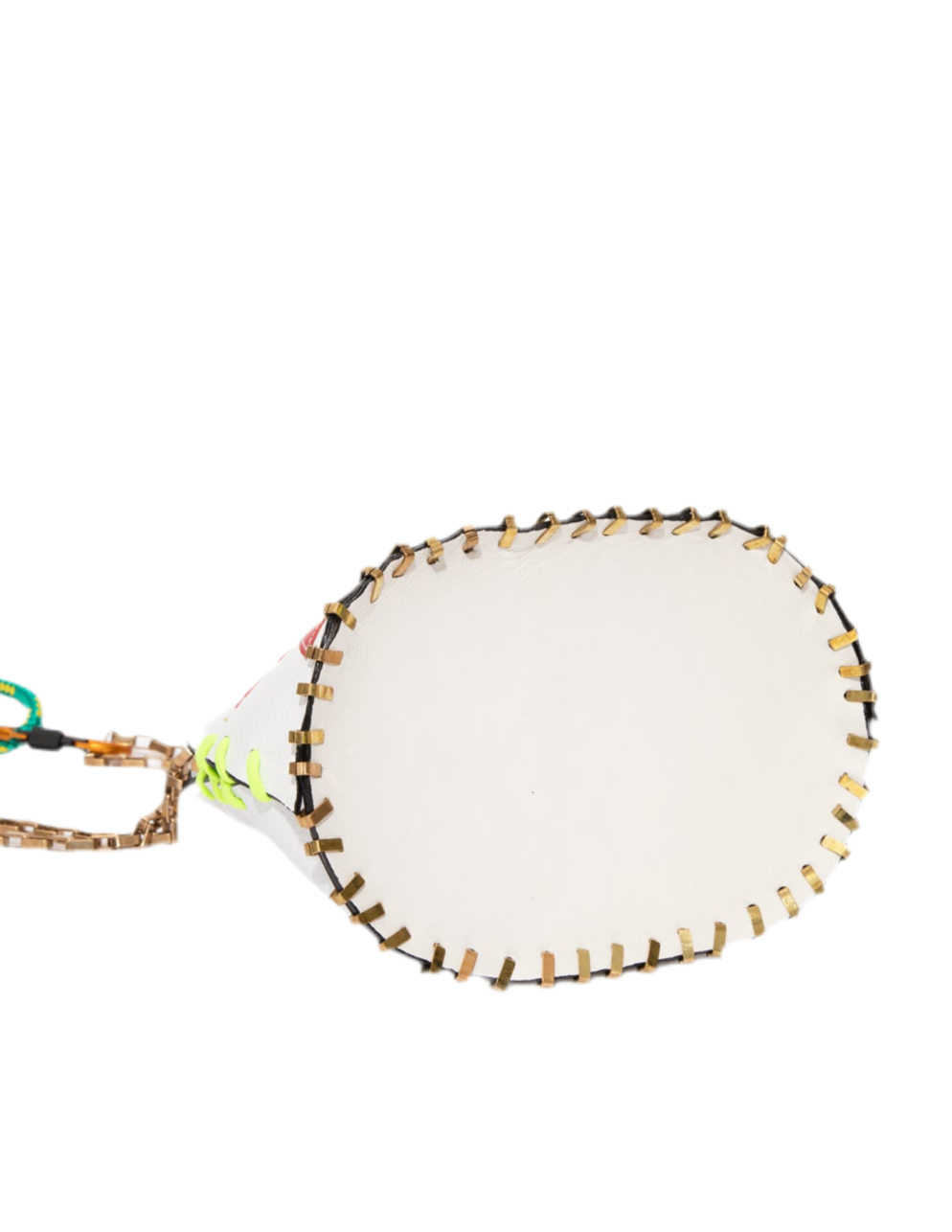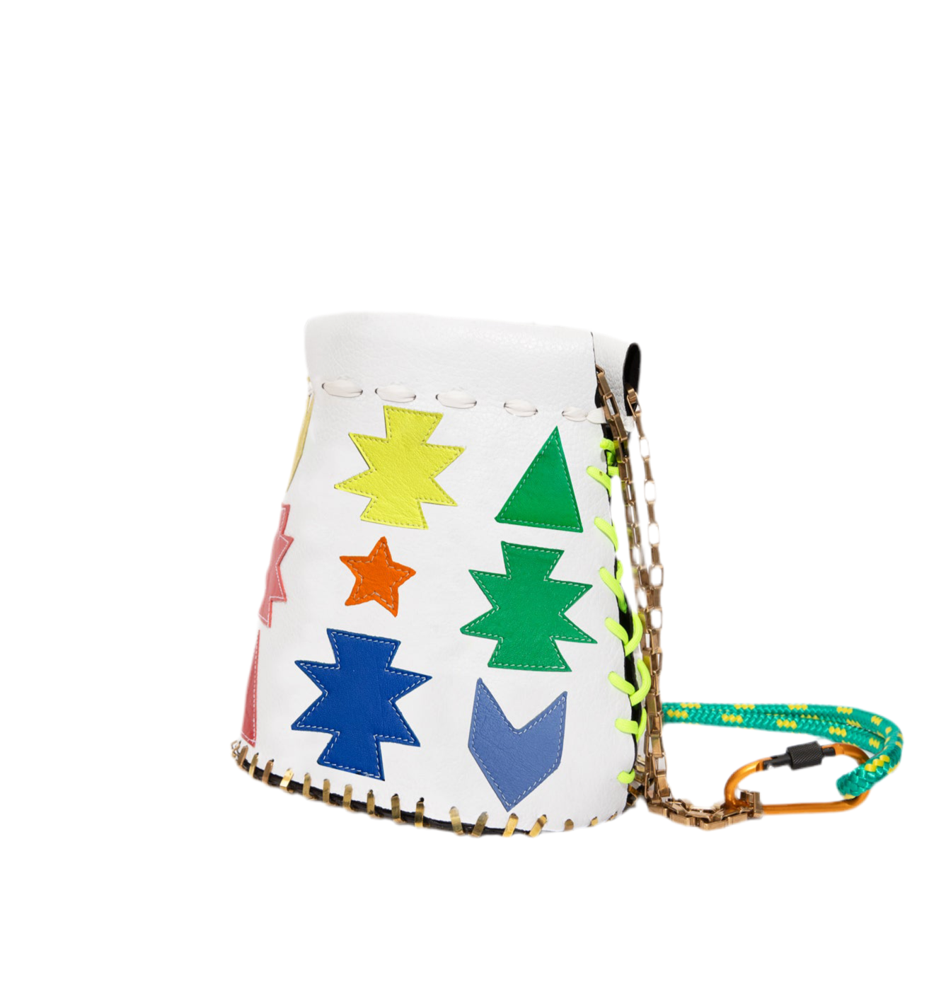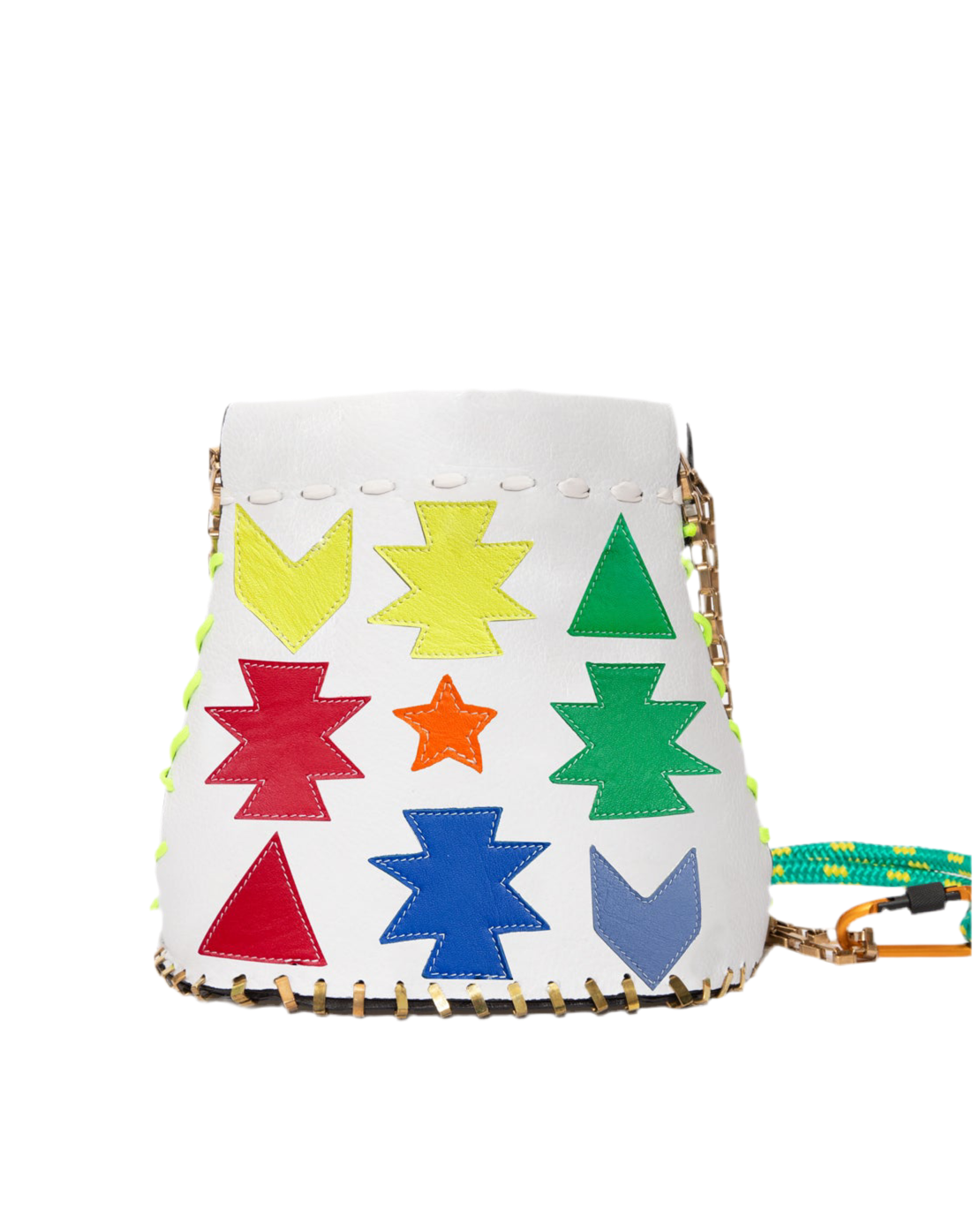 White calfskin leather bucket bag with multicoloured shapes and brass clip inlays at the bottom.