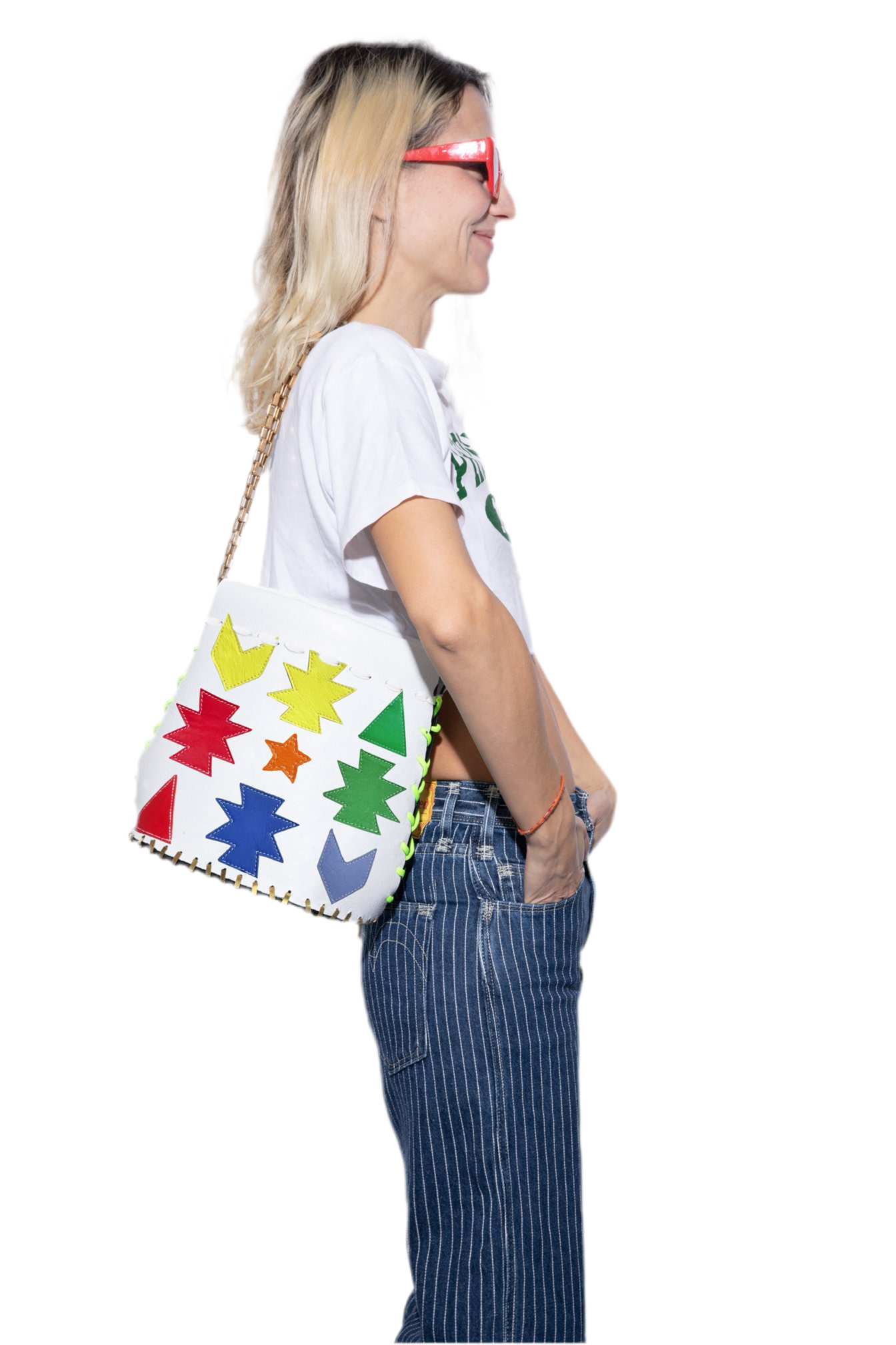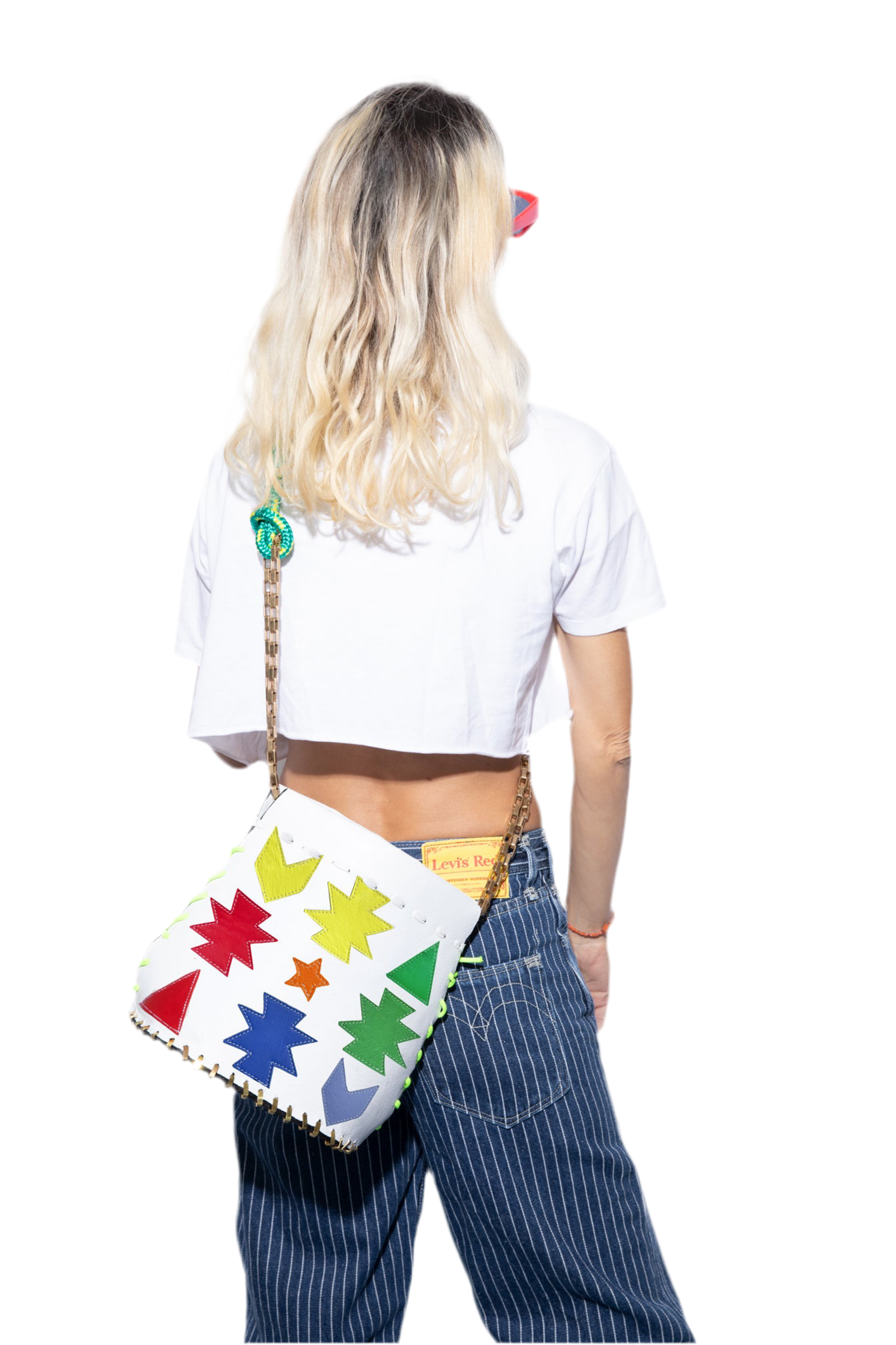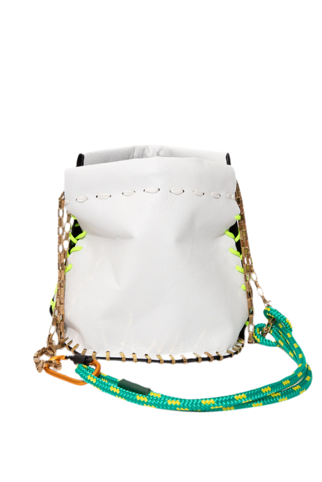 White calfskin leather bucket bag with multicoloured shapes and brass clip inlays at the bottom.