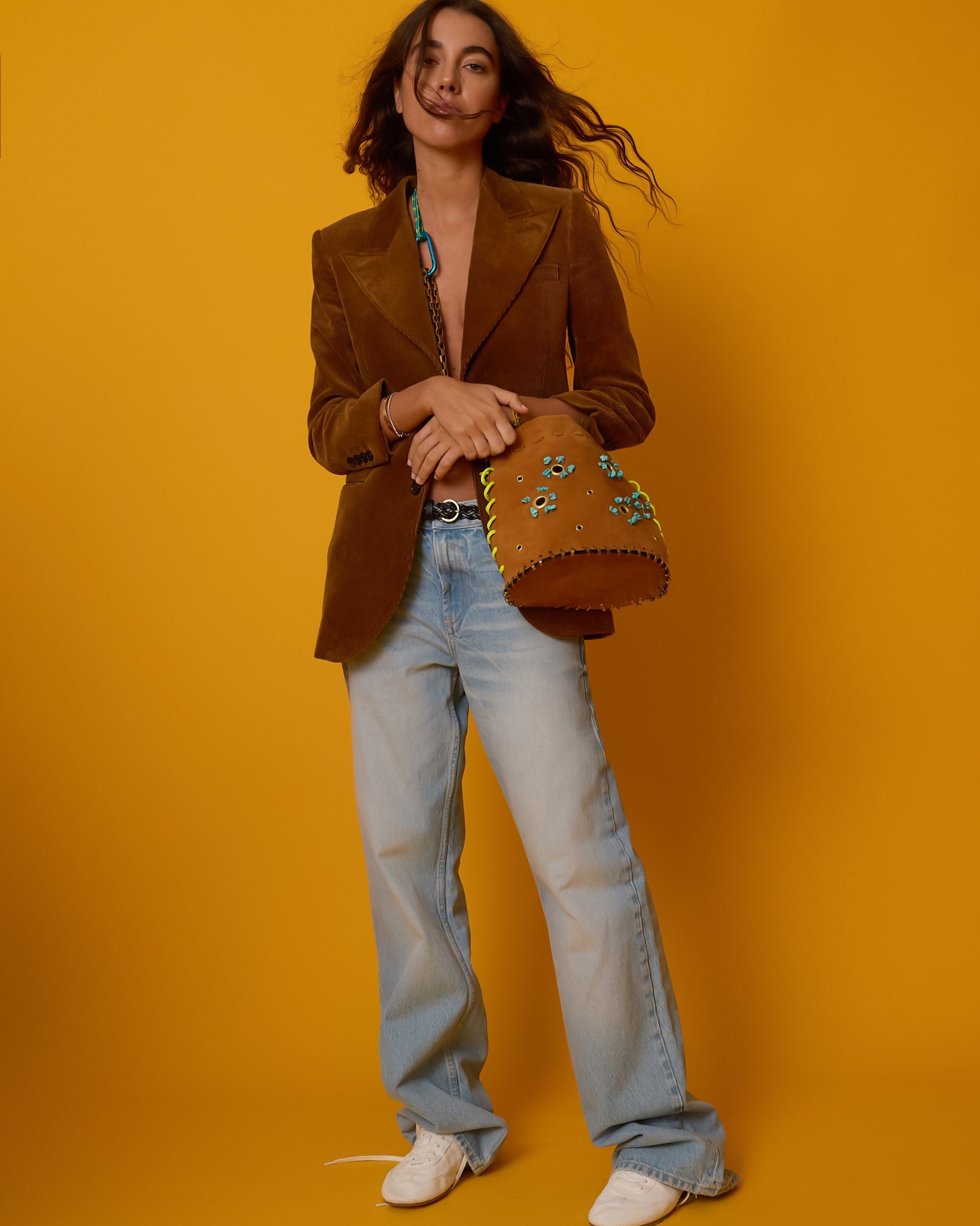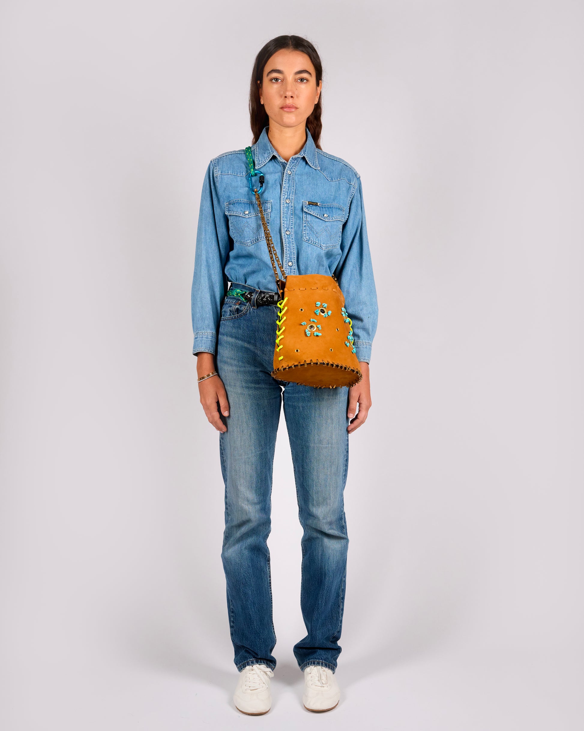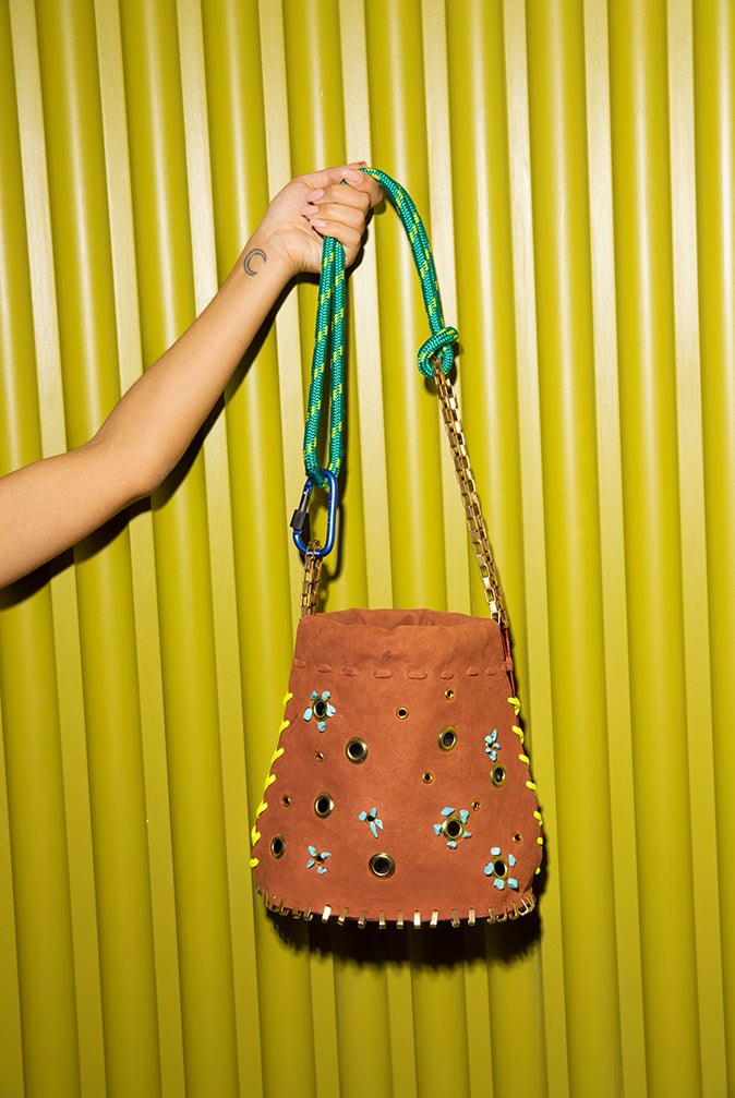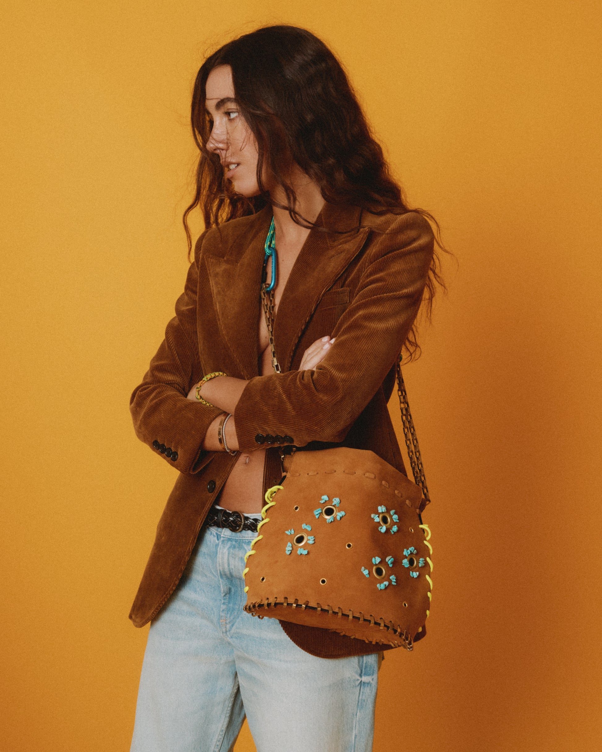 Playful details with multisided eyelets embellished with turquoise stone embroidery and brass clip inlays at the bottom.