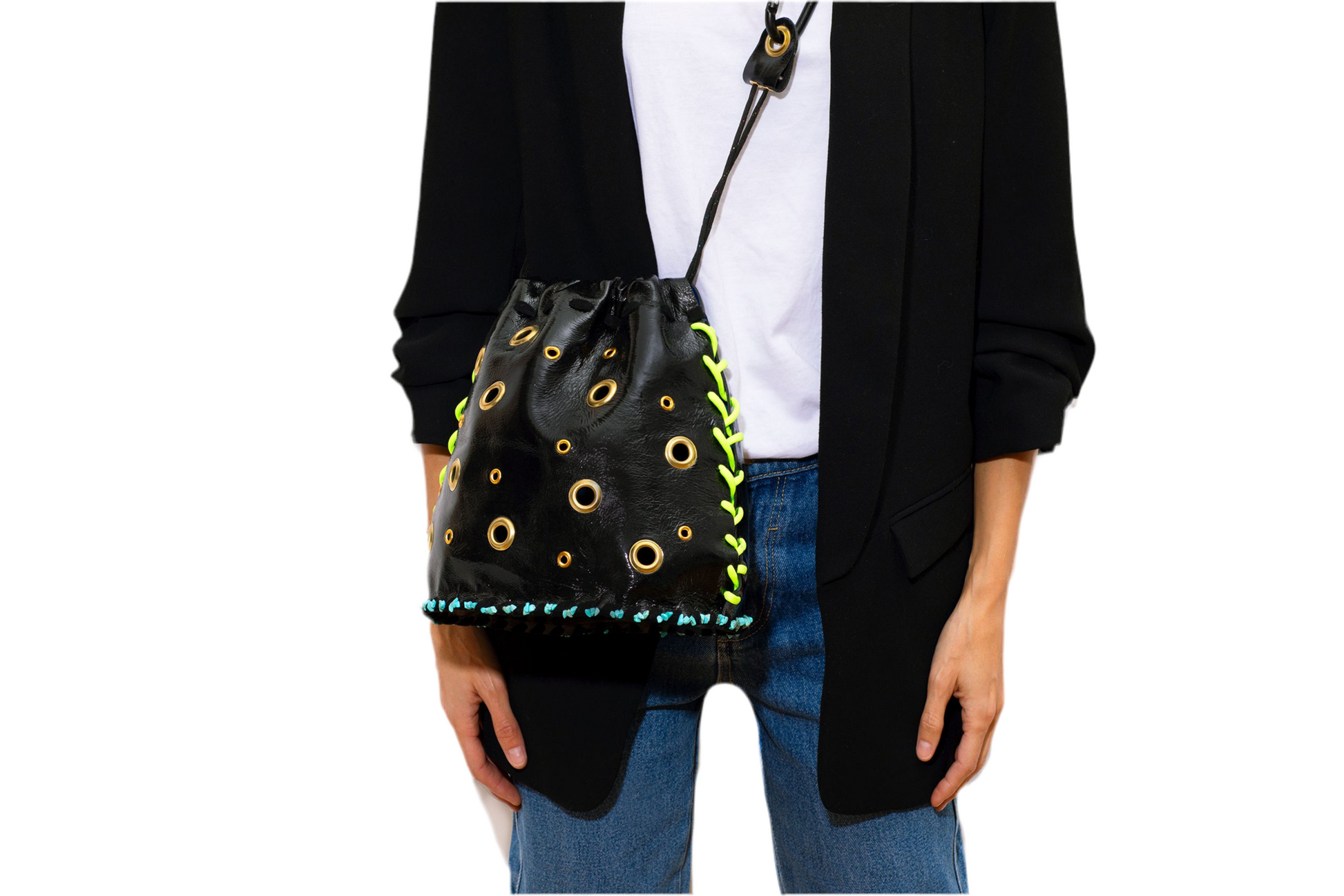 Patent black calfskin bucket bag, 100% Made in Italy.