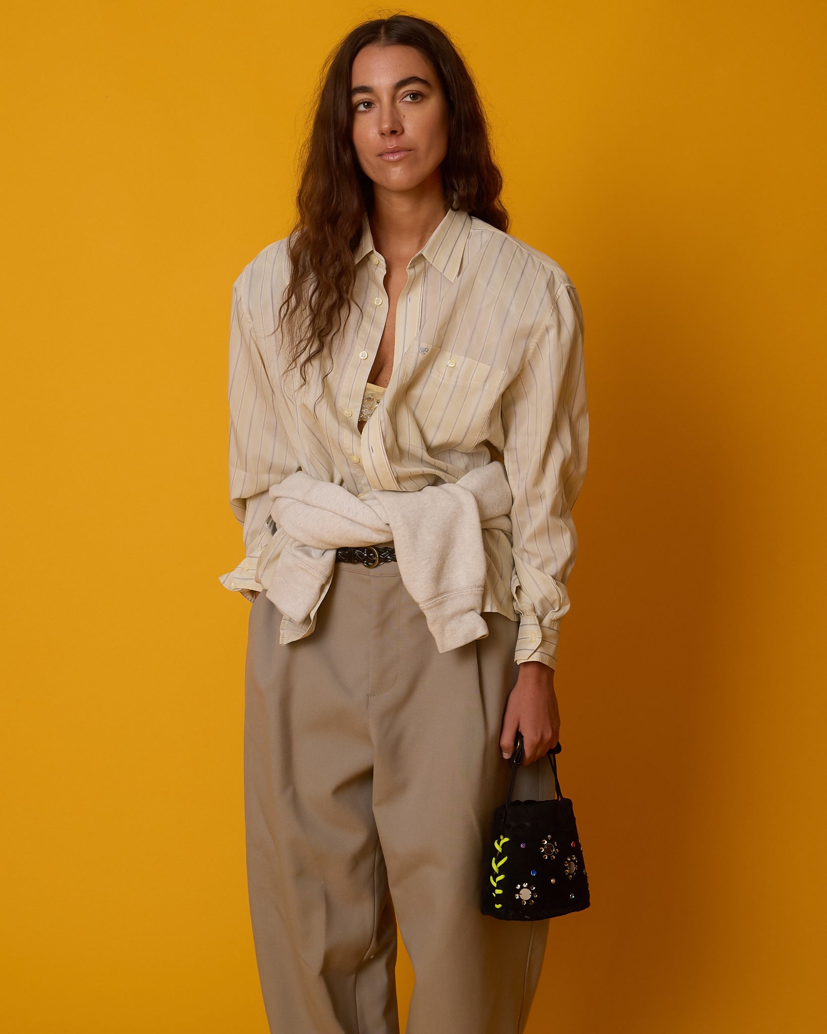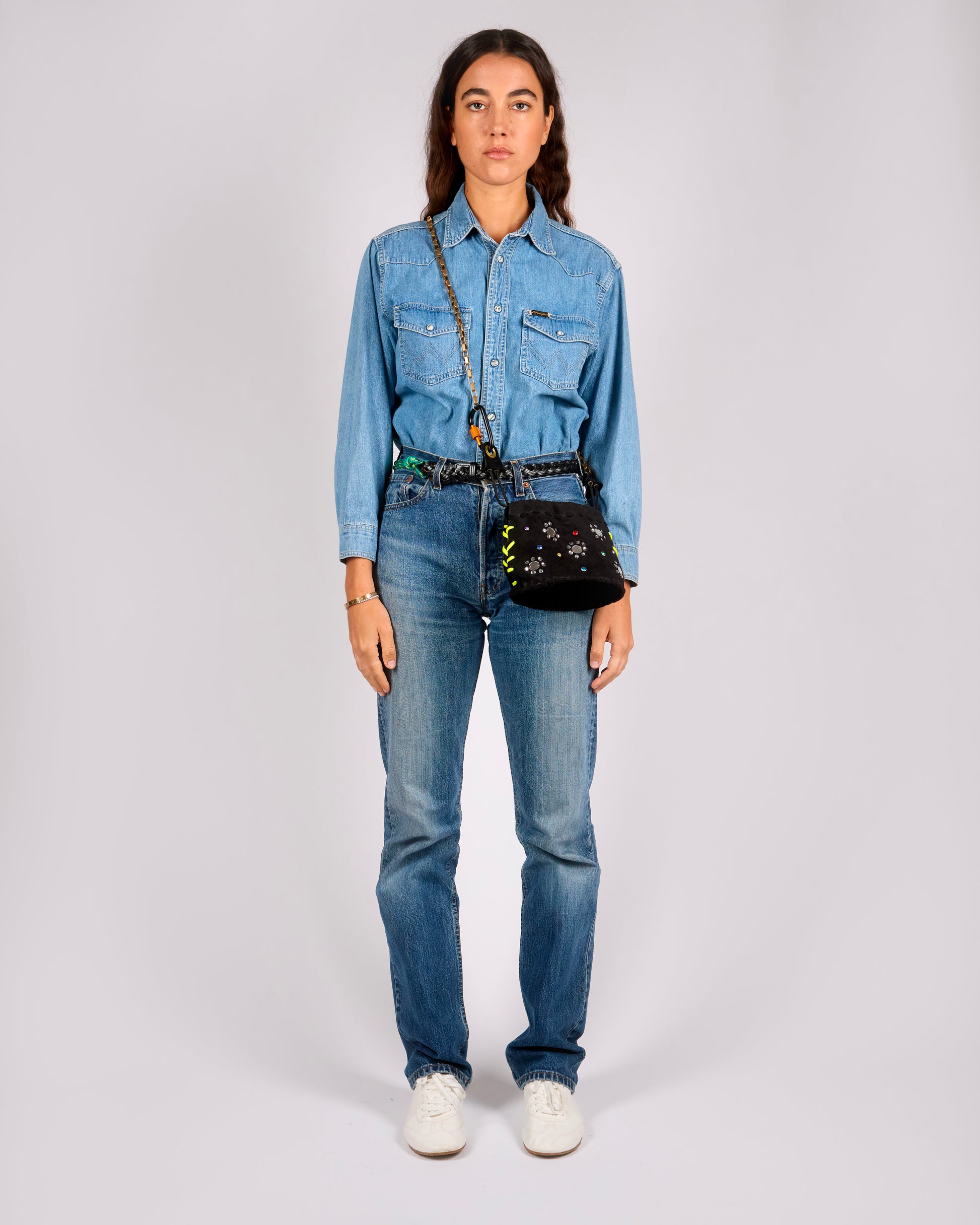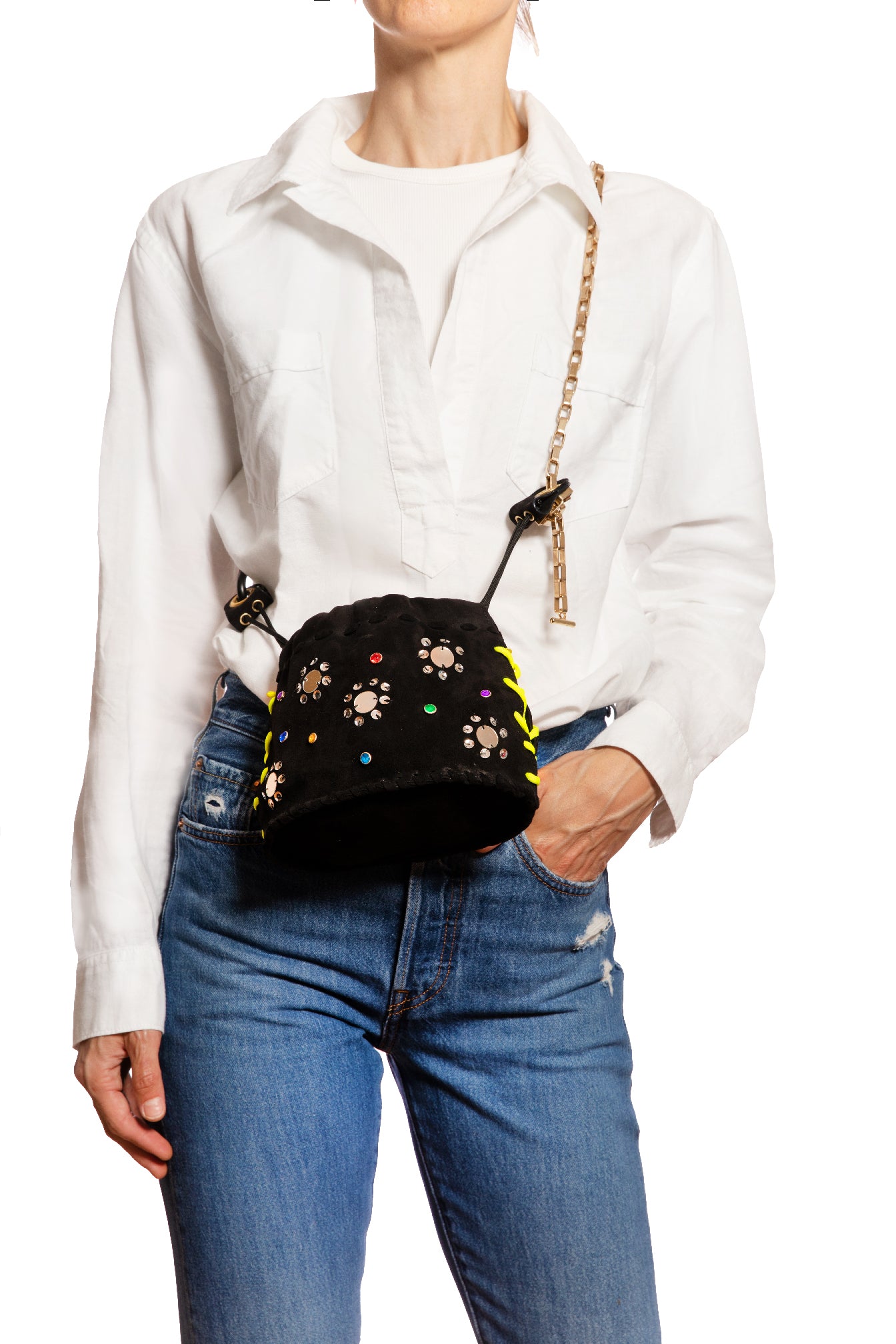 Black suede bucket bag adorned by mirrors, colored studs, and leather inlays.
