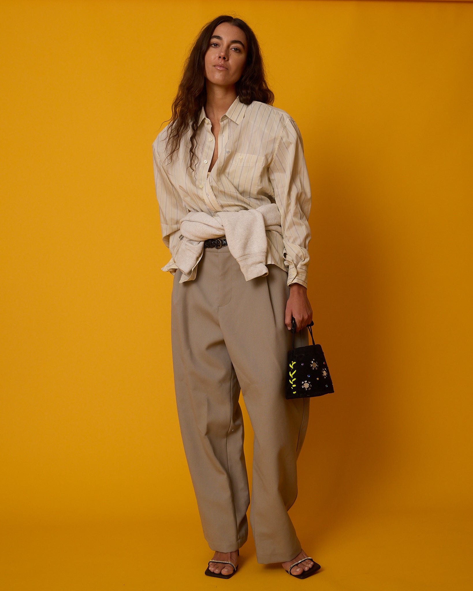 Drawstring converts to shoulder, crossbody or pouch. Brass-chain handle with carabiner.