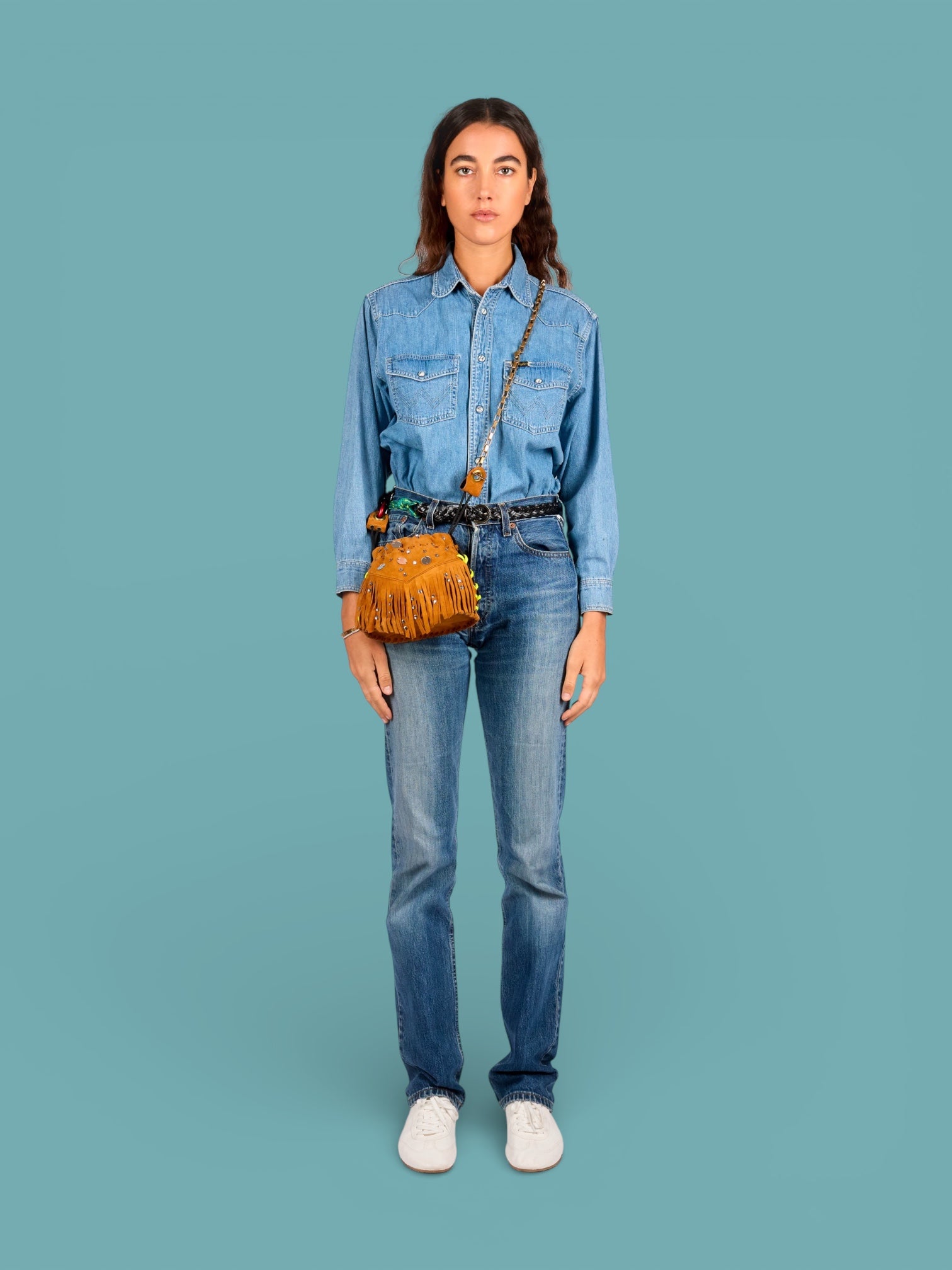 Cognac suede bucket bag adorned by mirrors and leather inlays.