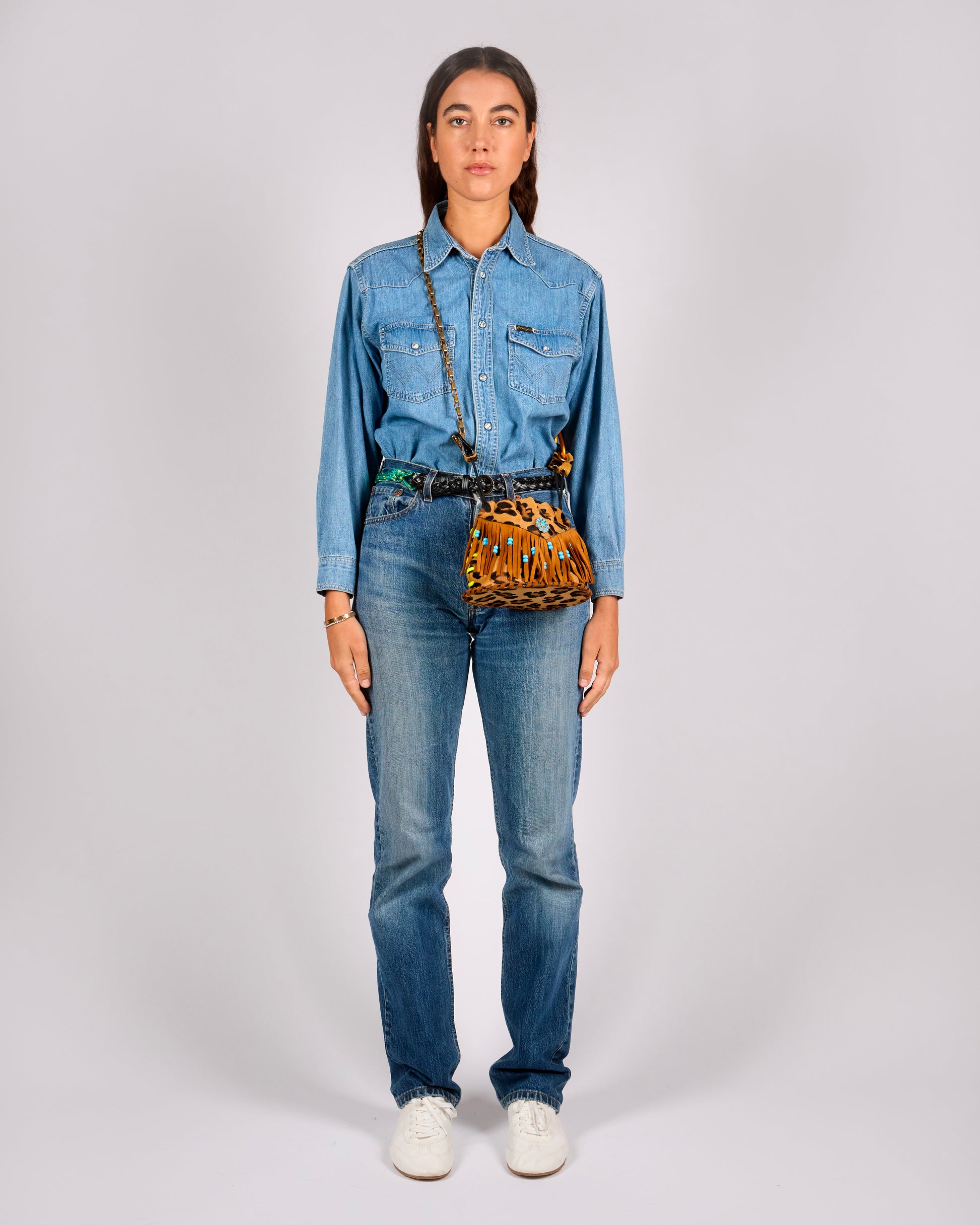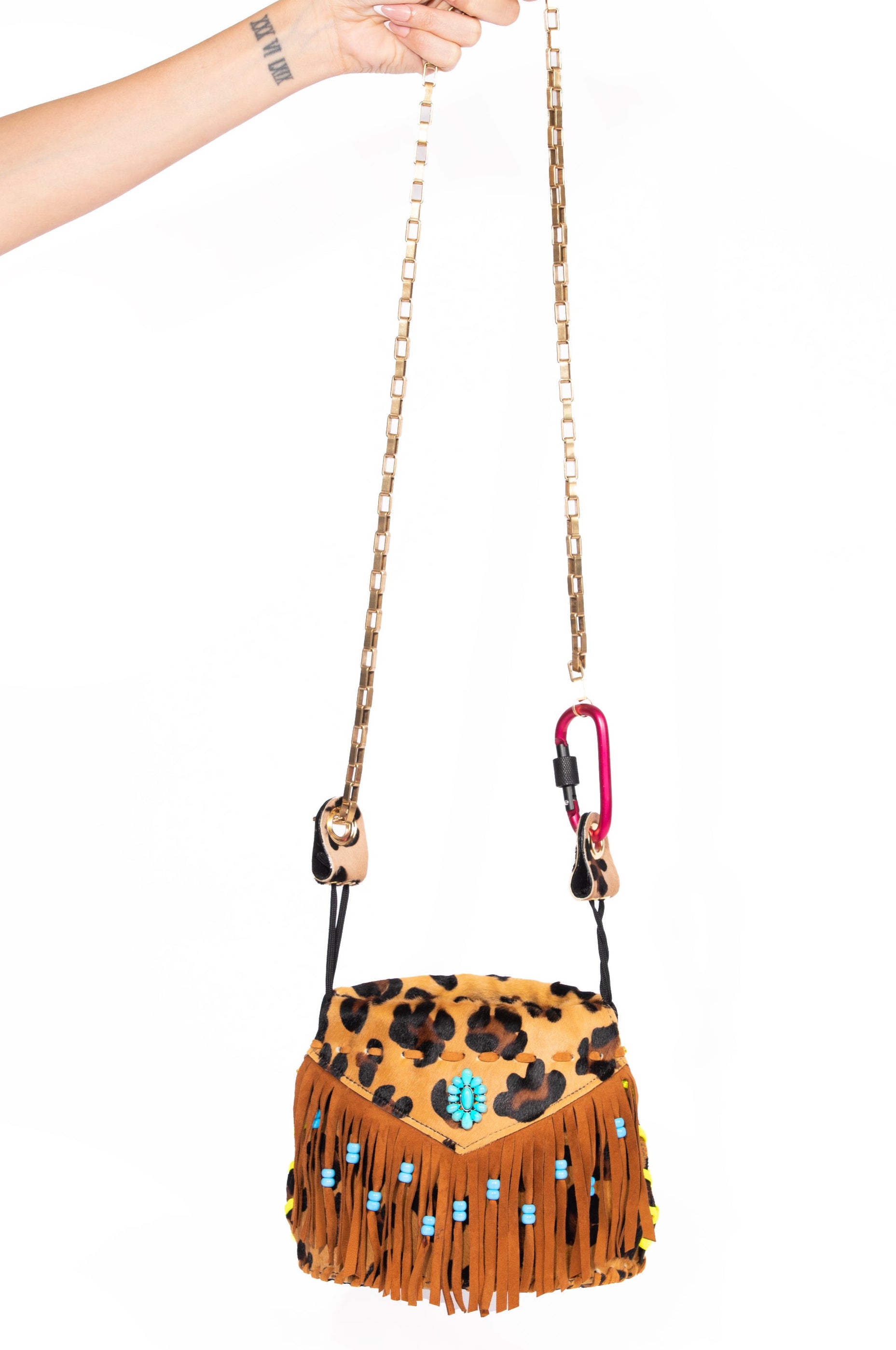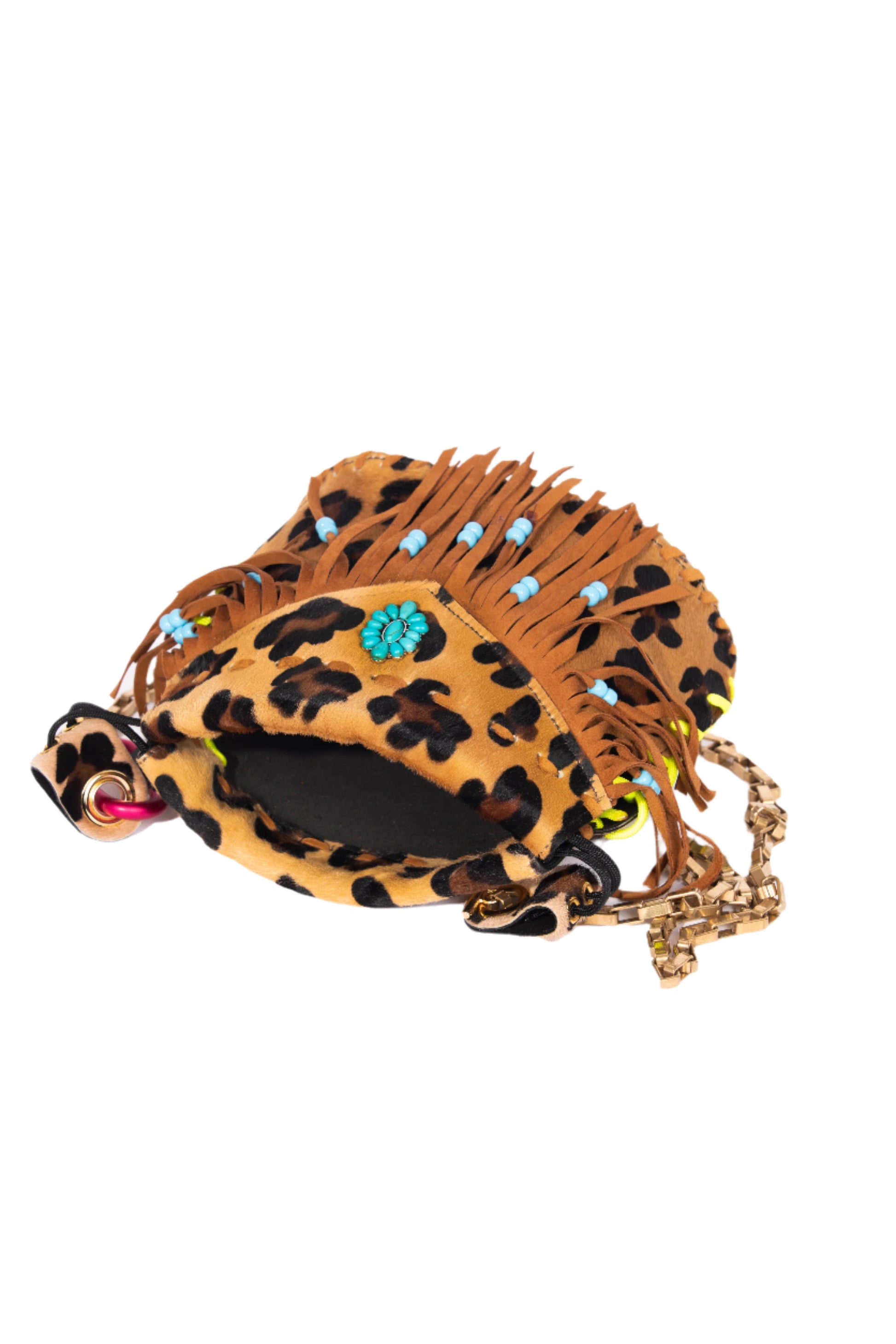 Leopard-print calfskin bucket bag with suede fringes, turquoise brooch and glass beads.
