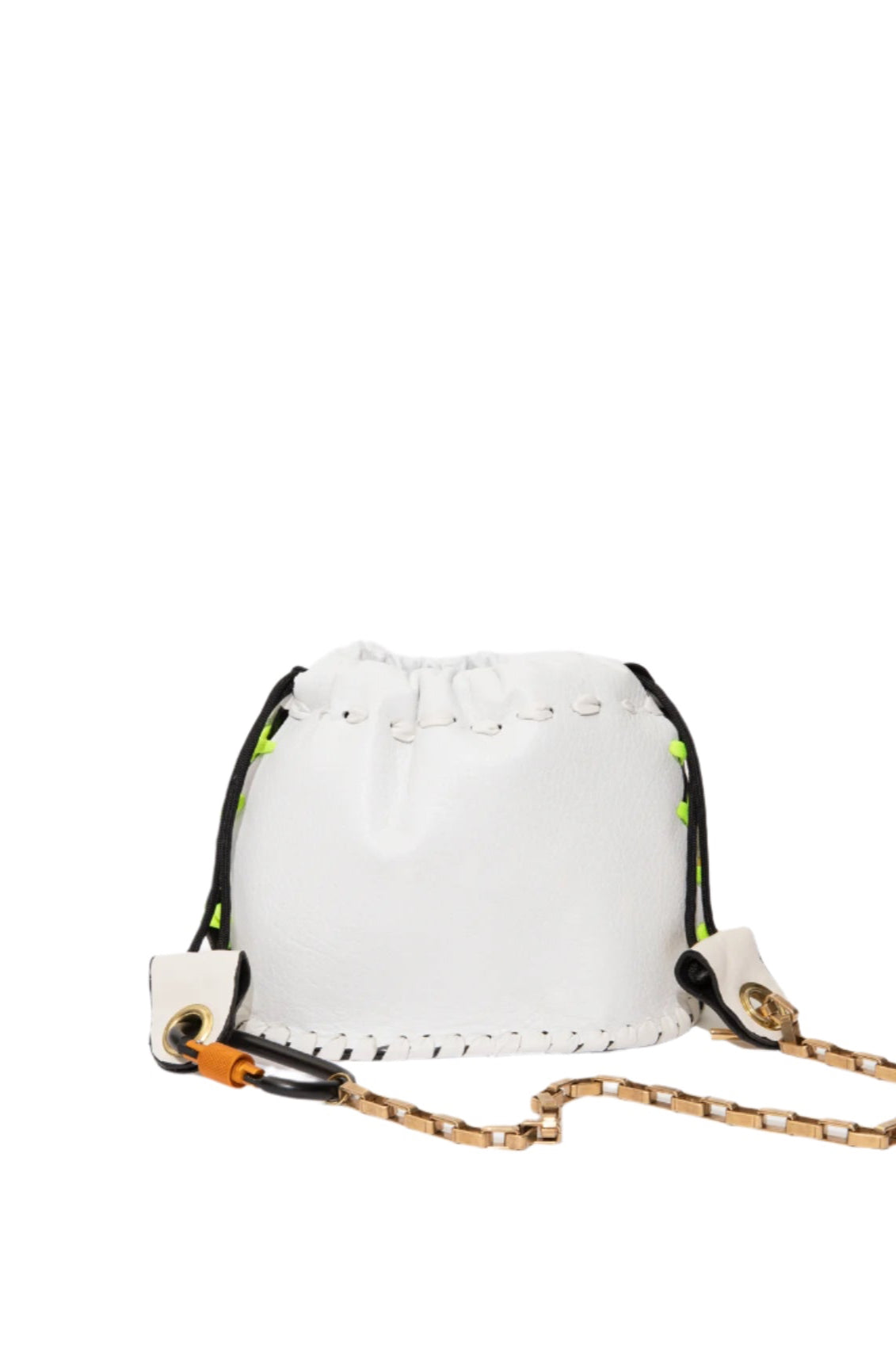 White calfskin leather bucket bag with handmade white leather fringes and multicoloured glass beads.