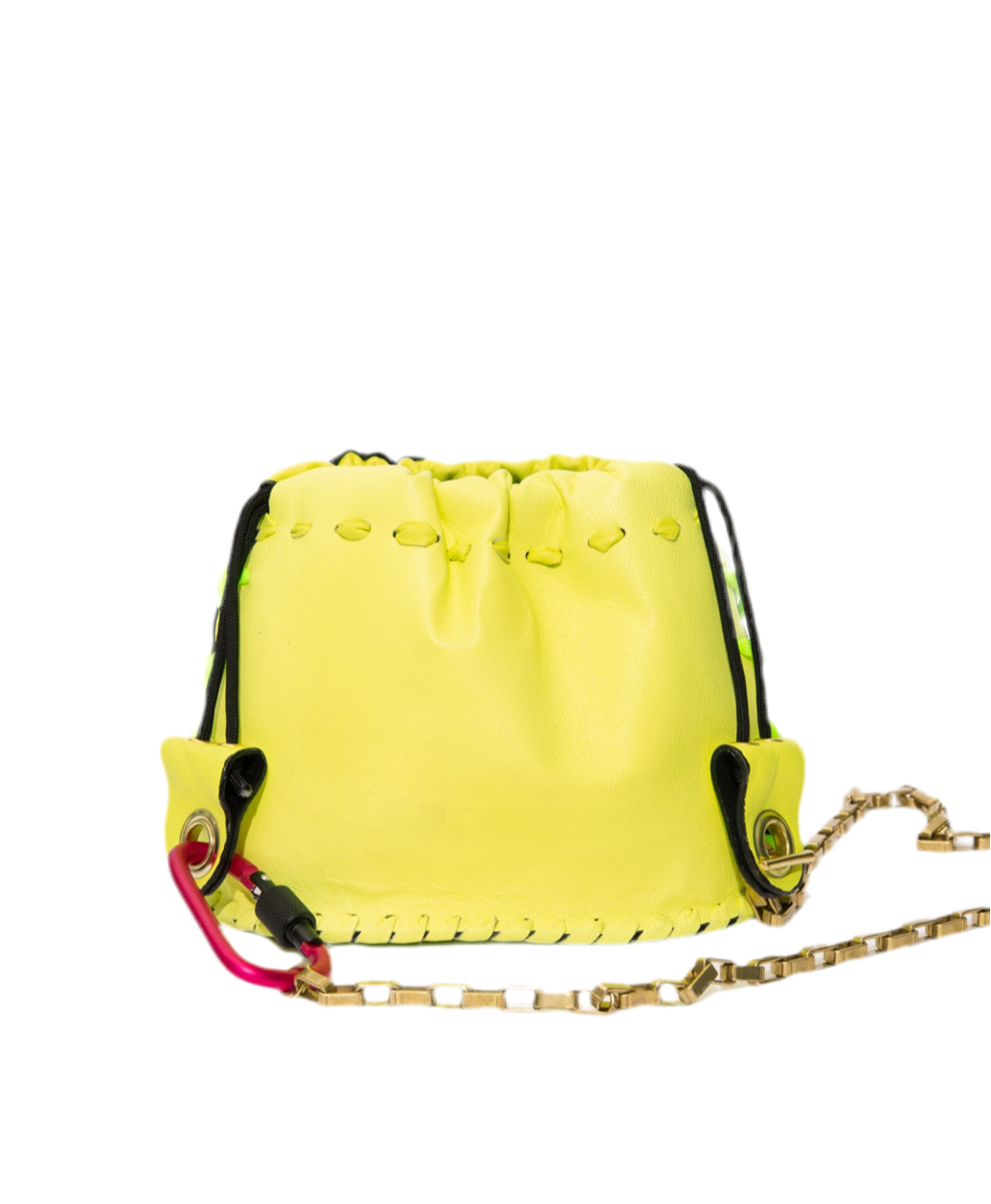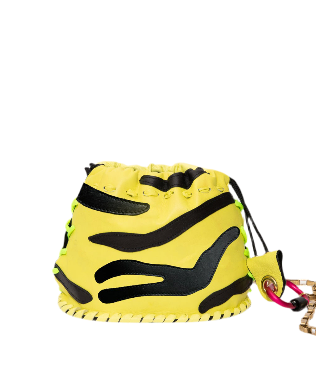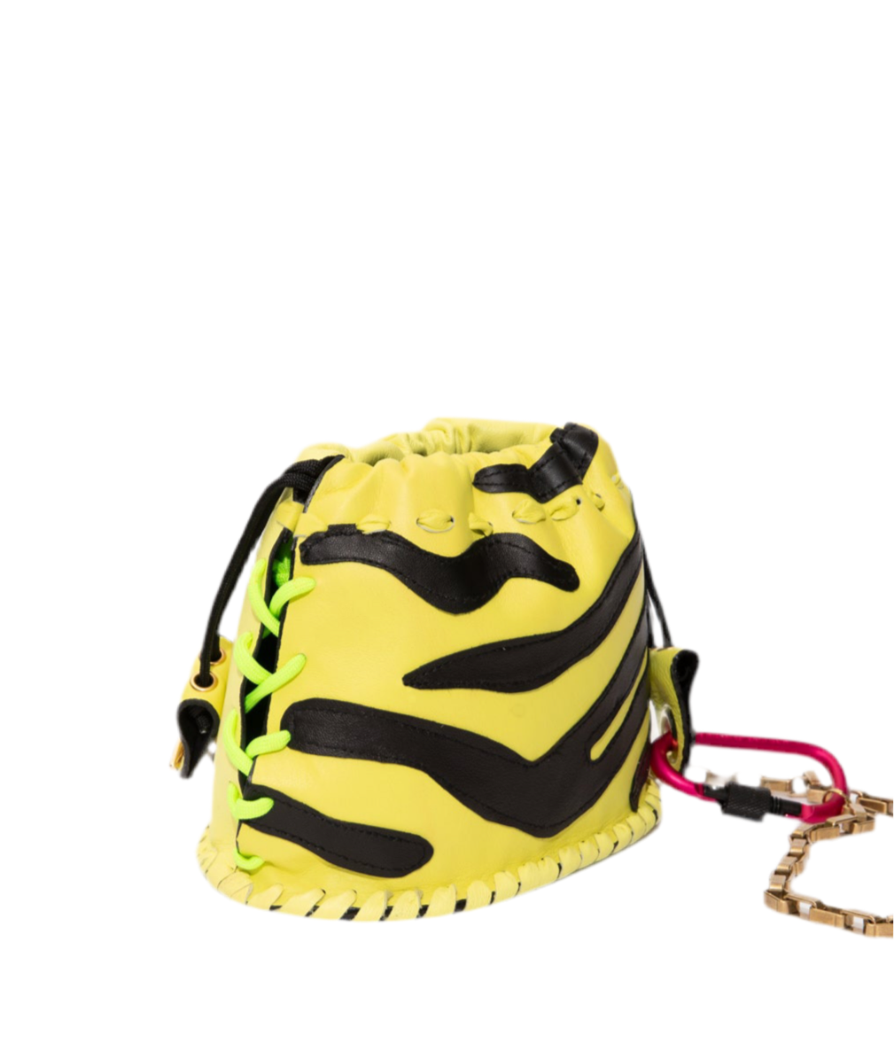 Yellow calfskin leather bucket bag with handmade black leather stripes and elegant leather inlays.