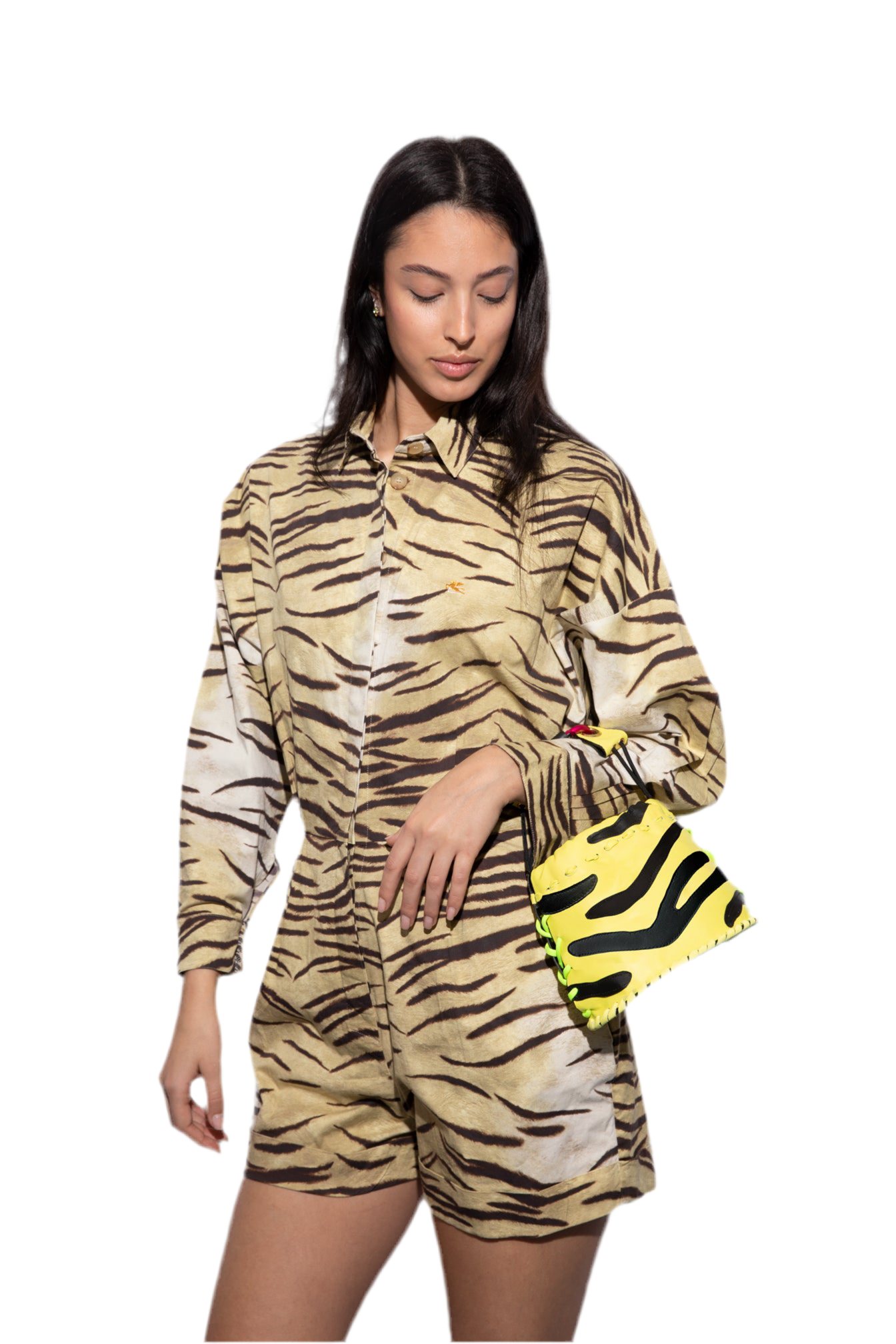 Handle in brass chain, leather, and carabiner for style and functionality.